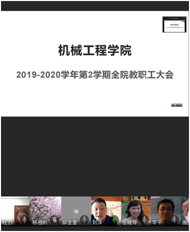 学院杜力院长通报了学校2020年党政工作要点,并结合学院的重点工作进行了传达和布置。本学期学院将在师资队伍建设、学科专业建设、中外交流与合作、产学研合作、人才培养、科研团队建设、招生就业、信息化办公等方面进一步加强;特别分析了学院面临的诸多机遇和挑战,希望老师们加强危机意识,未雨绸缪,在教学科研等方面积极作为,迎难而上;也希望老师们以此次在线教学为契机,总结经验、梳理问题与不足,找到自己的教学改革新的切入点,做好转变工作方式的准备。