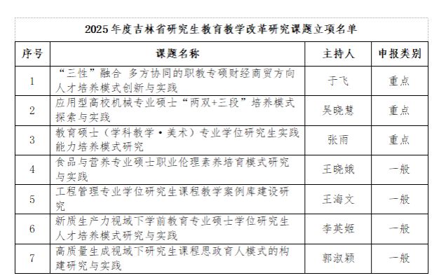 根据《关于开展2025年度吉林省研究生教育教学改革研究课题申报工作的通知》要求,经个人申报、部门推荐、学校初审把关、专家评审打分,按省教育厅限额推荐要求,best365推荐申报课题10项。经省教育厅组织专家评审,best365获立7项研究生教育教学改革研究课题,其中重点课题3项、一般课题4项。具体立项名单详见下表。