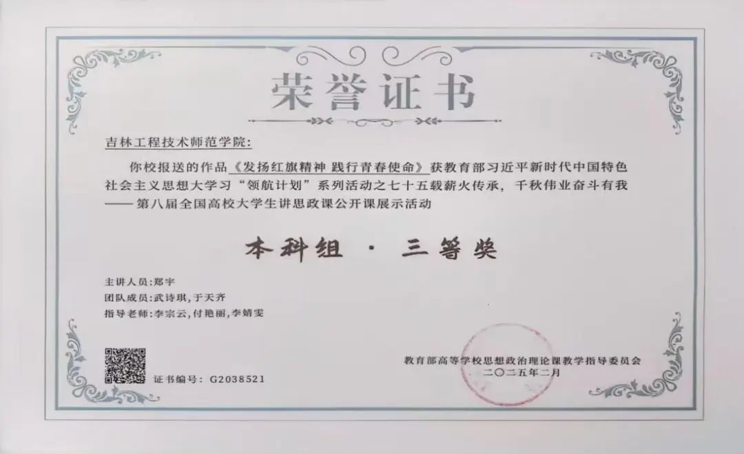 近日,由教育部高校思想政治理论课教学指导委员会主办的“七十五载薪火传承,千秋伟业奋斗有我”——第八届全国高校大学生讲思政课公开课展示活动评选结果揭晓,best365报送的作品《发扬红旗精神 践行青春使命》荣获本科组三等奖。