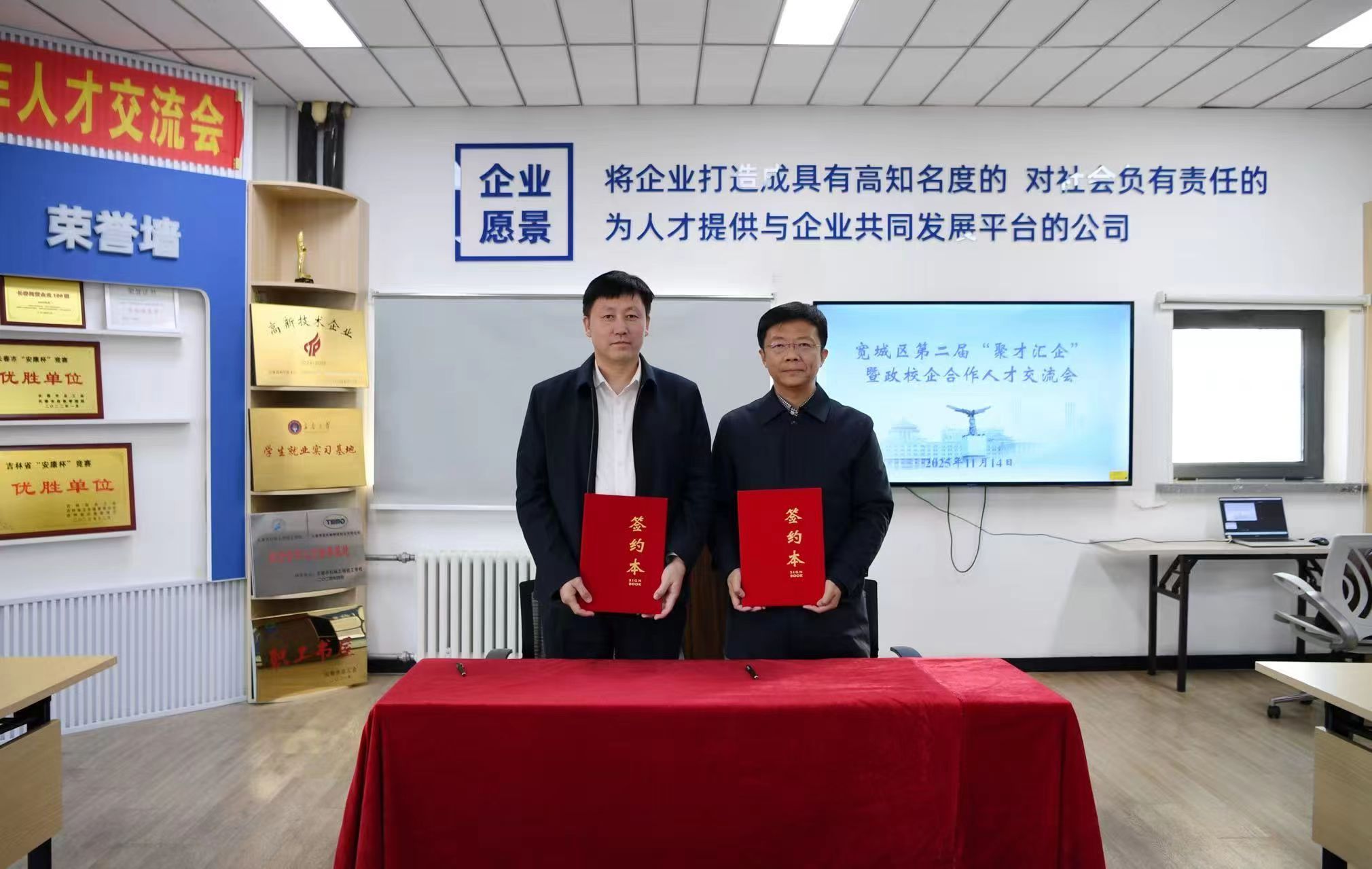 11月14日,由宽城区委、区政府主办、泰盟集团宽城区“蓝领工匠”工作室承办的“宽城区第二届‘聚才汇企’暨政校企合作人才交流会”成功举行。宽城区委组织部部长赵军伟,党组成员、副区长焦阳,学校党委副书记刘鹏飞出席会议。