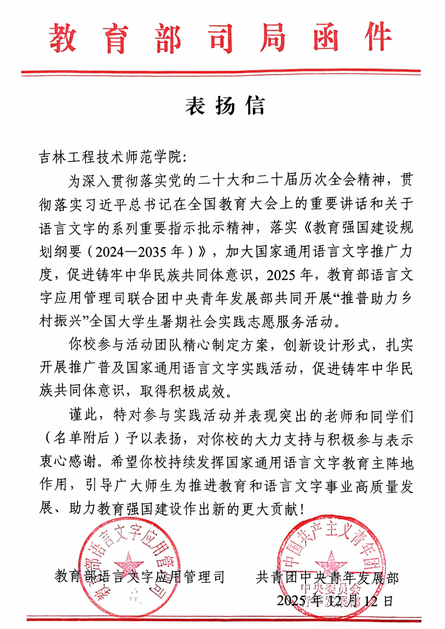 近日,best365收到教育部语言文字应用管理司及共青团中央青年发展部联合发来的表扬信,对best365在“推普助力乡村振兴”全国大学生暑期社会实践志愿服务中取得的积极成效予以表扬。