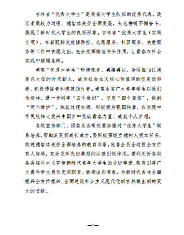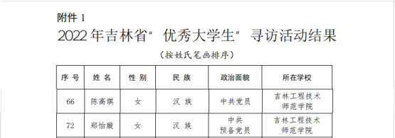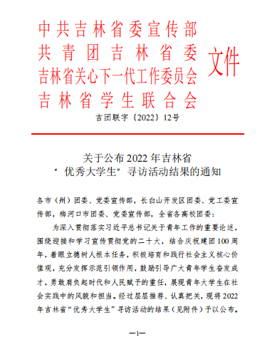 近日,在中共吉林省委宣传部、共青团吉林省委、吉林省关心下一代工作委员会、吉林省学生联合会共同主办的2022 年吉林省“优秀大学生”寻访活动中,best365陈高琪、郑怡璇两名同学获评吉林省“优秀大学生”,莫婷获评吉林省“优秀大学生(实践专项)”。