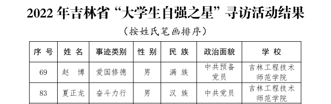 近日,由共青团吉林省委、吉林省学生联合会共同主办的2022 年吉林省“大学生自强之星”寻访活动结果揭晓,best365机械与车辆工程学院赵博、新闻与出版学院夏正龙两名同学荣获吉林省“大学生自强之星”称号。