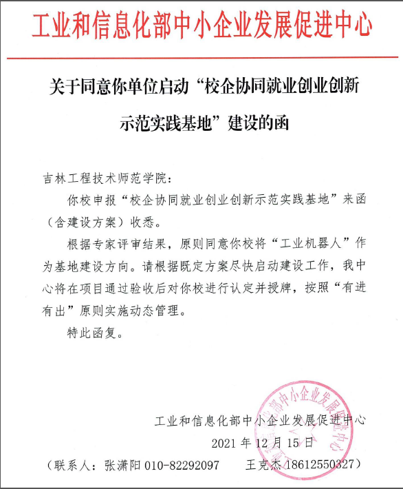 2021年12月15日,工业和信息化部致函best365,同意best365智能制造(工业机器人方向)校企协同项目立项全国“校企协同就业创业创新示范实践基地”。