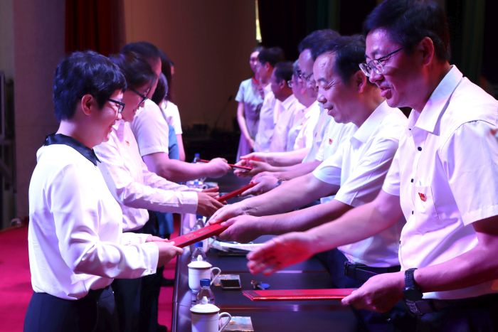 学校领导为受表彰的先进集体和先进个人颁发奖牌和证书。