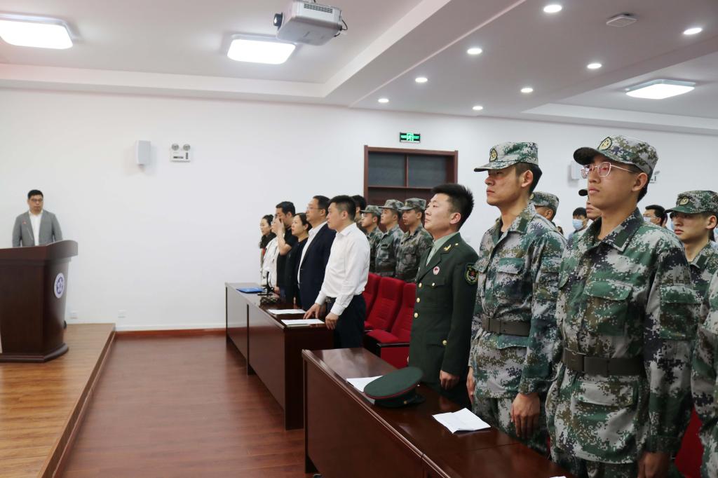 会议在庄严的国歌声中开始。首先,学工部学生管理科科长董浩然宣读了《2021年大学生预备连成员名单》;王宝龙部长向预备连授旗;刘晓敏为预备连学生代表颁发证书。