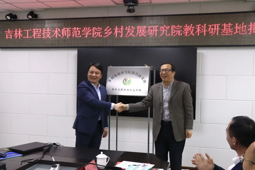 会上,举行了“乡村发展研究院教科研基地”揭牌仪式。乡村发展研究院教科研基地积极探索“高校+地方政府”的综合服务模式,开展农村创新创业、乡村产业发展、农户生产技术、农村经济社会等方面的研究与实践工作,能有效衔接脱贫攻坚成果,发挥校企双方优势服务吉林省乡村振,为乡村振兴提供科学决策和培养高素质、高技能的应用型人才,同时也为学生实习、实训、就业提供更大空间。