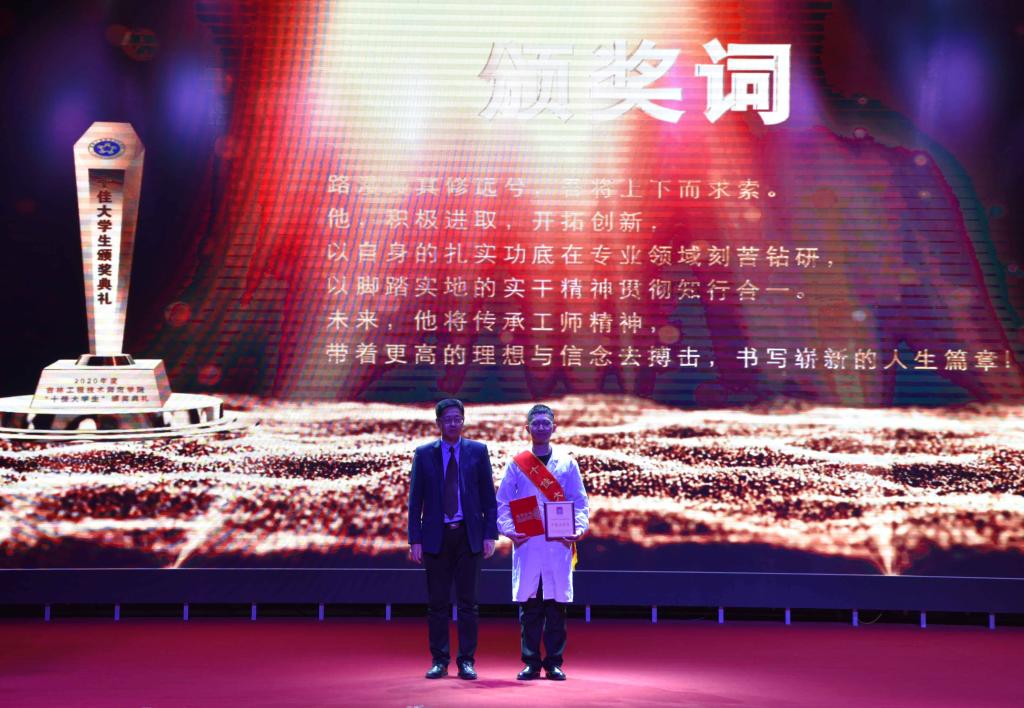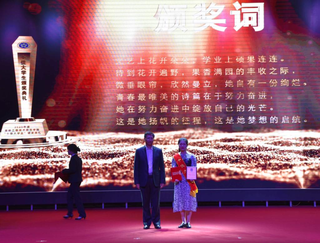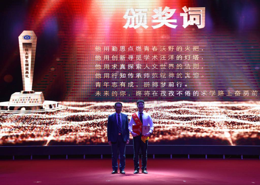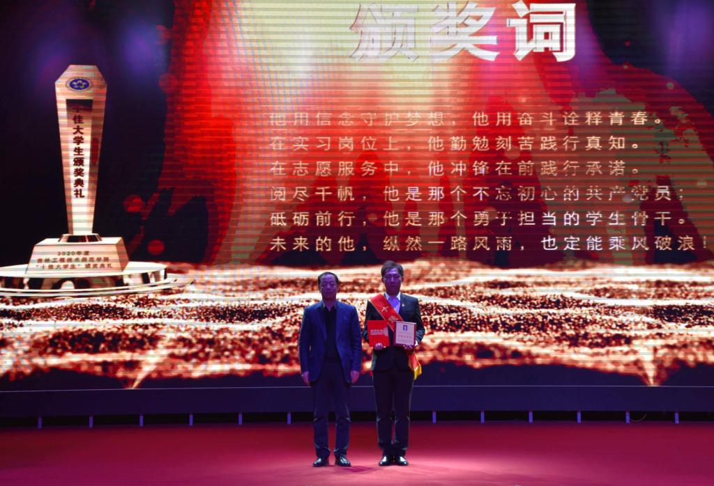 随后举行了2020年度“十佳大学生”颁奖典礼,在学业科研、科技创新、社会实践、志愿服务等方面有突出表现的10名十佳大学生上台领取了奖牌证书。