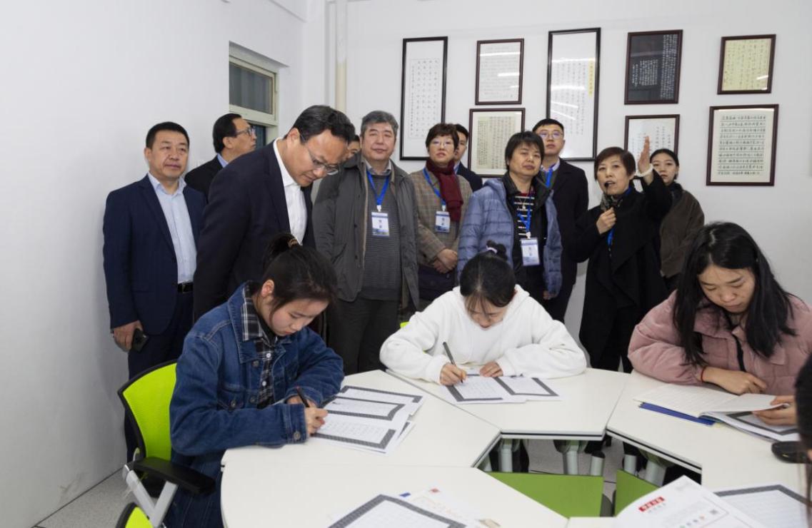 考察组首先实地走访了校史馆、基地实体执行部门传媒学院,查阅了学校相关制度文件及相关资料,走访了传媒学院普通话培训测试中心、经典诵读实训中心、软硬笔训练中心、智能录播室等实践场所,观看了学校“推普脱贫”工作宣传片。