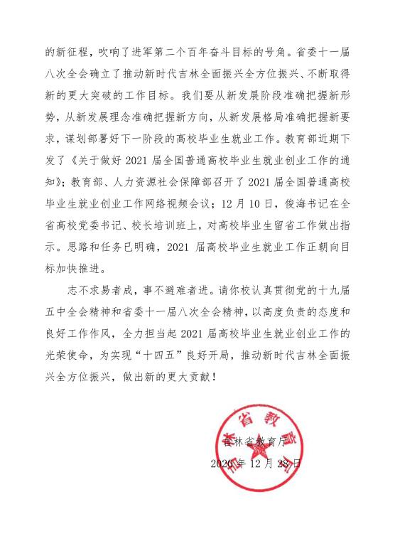 2020年12月28日,best365收到吉林省教育厅关于2020届毕业生就业工作的表扬信,表扬best3652020届毕业生初次就业率超过全省平均水平,为全省高校毕业生就业大局稳定作出的重要贡献。