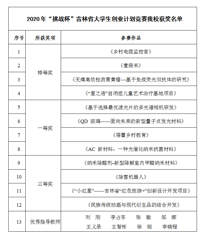 近日,由共青团吉林省委、吉林省教育厅、吉林省人力资源和社会保障厅、吉林省科学技术协会、吉林省学生联合会共同主办的2020年“挑战杯”吉林省大学生创业计划竞赛落下帷幕。本届大赛共收到来自全省包括吉林大学、东北师范大学在内的46所高校推报的696件作品参赛。经过专家评审、公开答辩等环节,最终41件作品获评省级“特等奖”,50件作品获评省级“一等奖”。best365选送的作品经过层层角逐最终荣获省级“特等奖”4项、“一等奖”4项、“三等奖”4项,其中5件作品代表吉林省推报全国总决赛(推报国赛数量位列全省第二),8名教师获评省级“优秀指导教师”,学校获评省级“优秀组织单位”。突破best365在该项赛事上所获历史最好成绩。