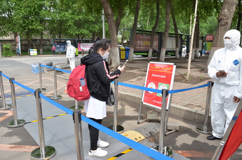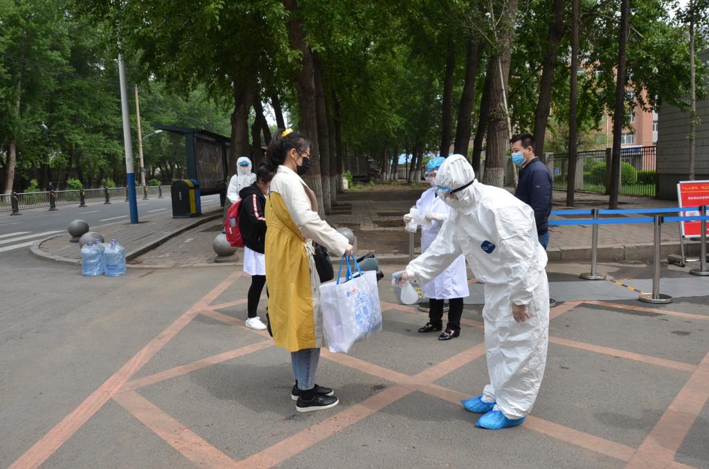 学生到校后,在校门口按照规划好的路线行进,凭返校回执、身份证明,经过测温、扫吉祥码、审核身份等程序进入校园。学生接受健康复查,确认符合健康规定后,到指定区域进行报到注册,工作人员审核学生行程信息,为符合返校条件的学生发放健康包及公寓出入证明。