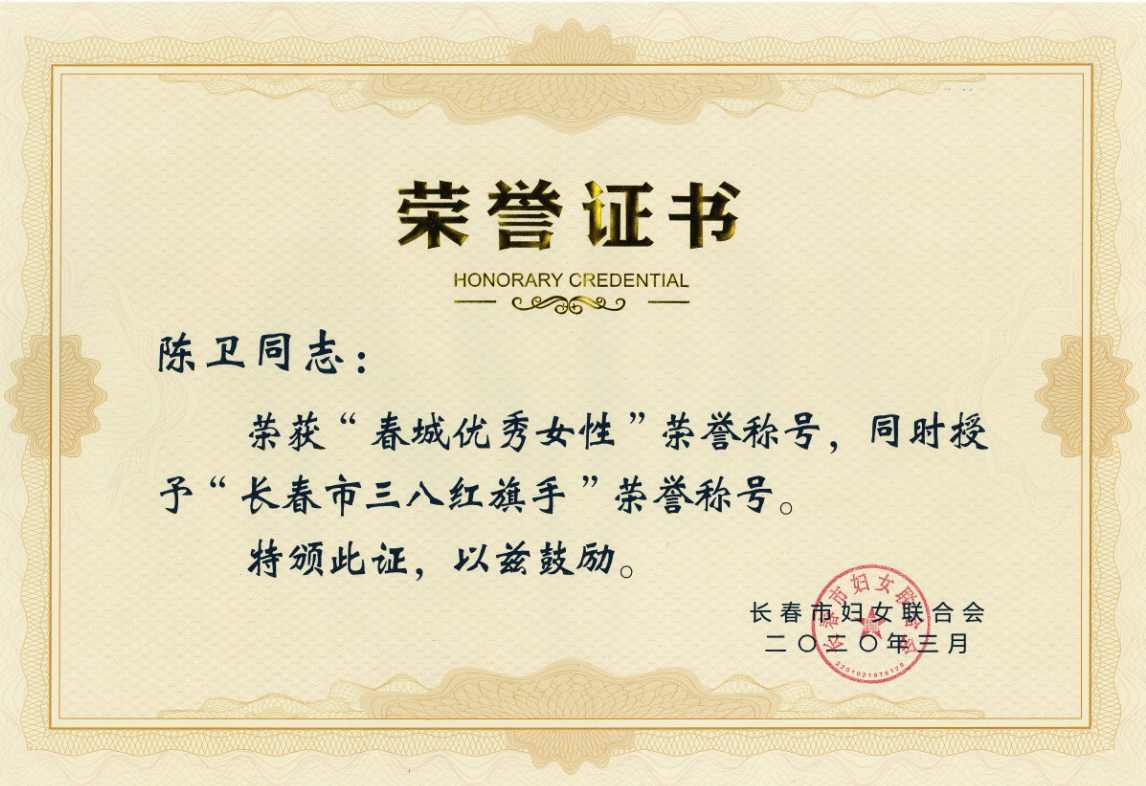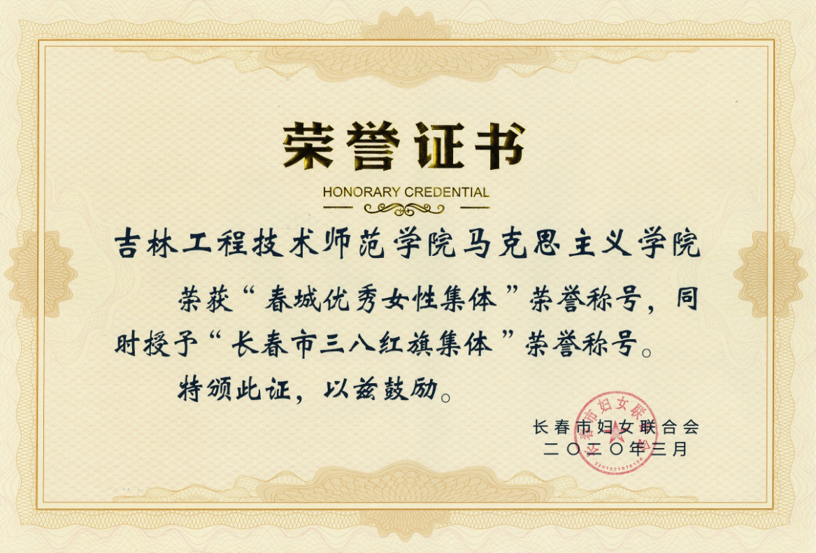 近日,长春市妇联在全市开展了“春城杰出女性”评选活动,best365马克思主义学院荣获“春城优秀女性集体”、“长春市三八红旗集体”荣誉称号;马克思主义学院陈卫老师荣获“春城优秀女性”、“长春市三八红旗手”荣誉称号。