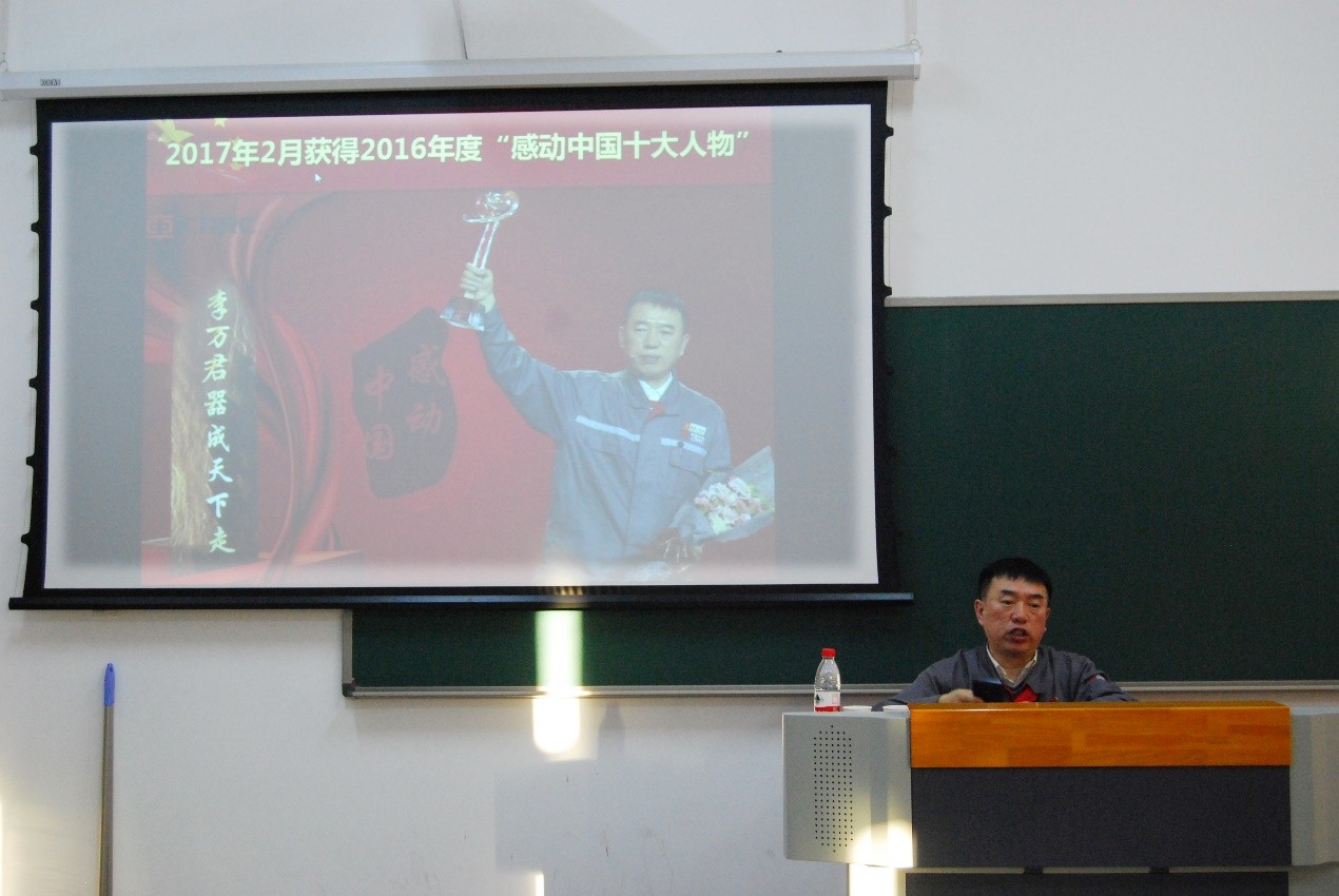 李万君结合个人的成长之路,用平实的语言从树立理想、争做工匠,无私奉献、培育工匠,敢于担当、勇于创新,忠诚企业、报效国家,用匠心实现中国梦、高铁梦、个人梦等五个方面进行了分享。他始终坚守着做合格电焊工人的初心,始终坚守在轨道客车转向架焊接岗位。他有着“做像样的技术工人”的坚守,他有着“做个非凡的大国工匠”的执着,他有着“把技能传承下去才有价值”的奉献精神,他不忘初心、脚踏实地,他保持本色、敬业报国。在他身上体现的是一名焊工对个人梦想、一名大国工匠对中国梦的执着追求与不懈努力。他是平凡的工匠,更是非凡的大师。同学们被他的事迹深深感染,不时地响起热烈的掌声。