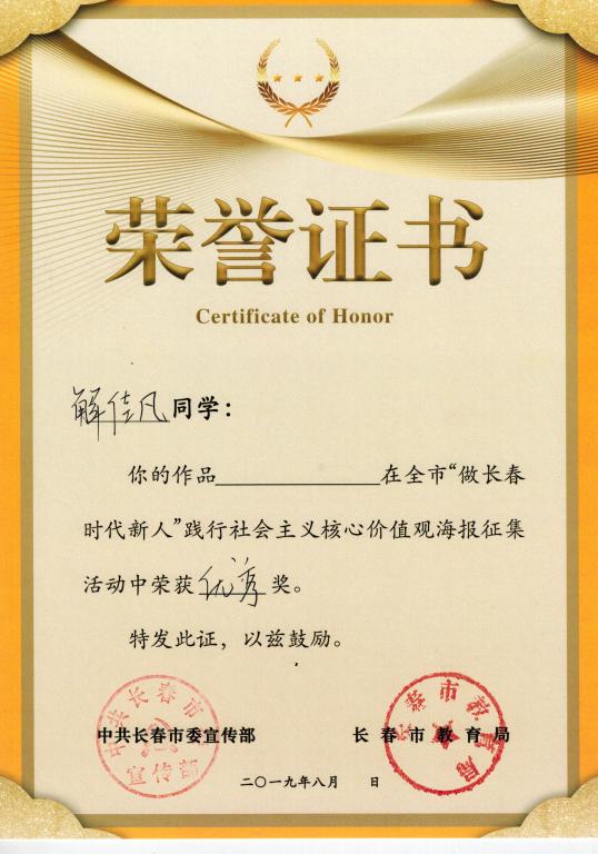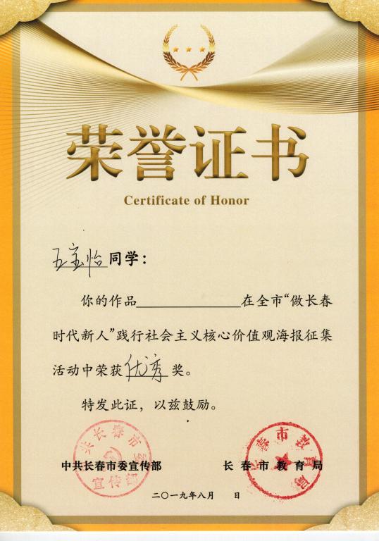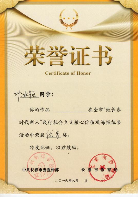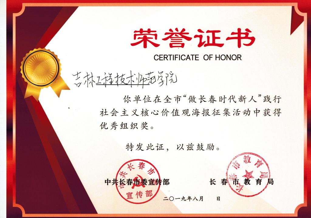 为庆祝新中国成立70周年,培育和践行社会主义核心价值观,推进“我和我的祖国”群众性主题宣传教育活动广泛开展,市委宣传部于2019年6月开展“做长春时代新人”践行社会主义核心价值观主题活动。由市委宣传部、市委教育工委、有关专家组成评审小组,按照活动评选标准和数量确定获奖名单,颁发获奖证书,同时评选出优秀组织奖。best365艺术学院解佳凡老师、影视动画专业叶冰颖同学、视觉传达专业王宝怡同学上报的海报作品获得“优秀奖”。best365获得全市“做长春时代新人”践行社会主义核心价值观“优秀组织奖”。