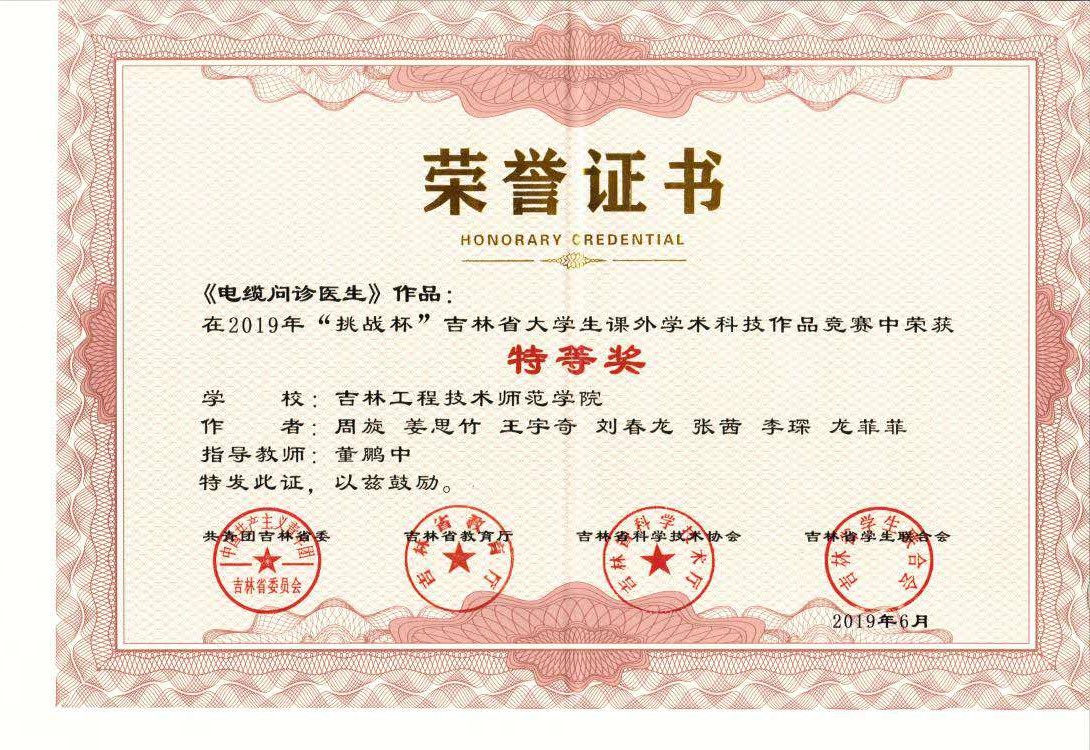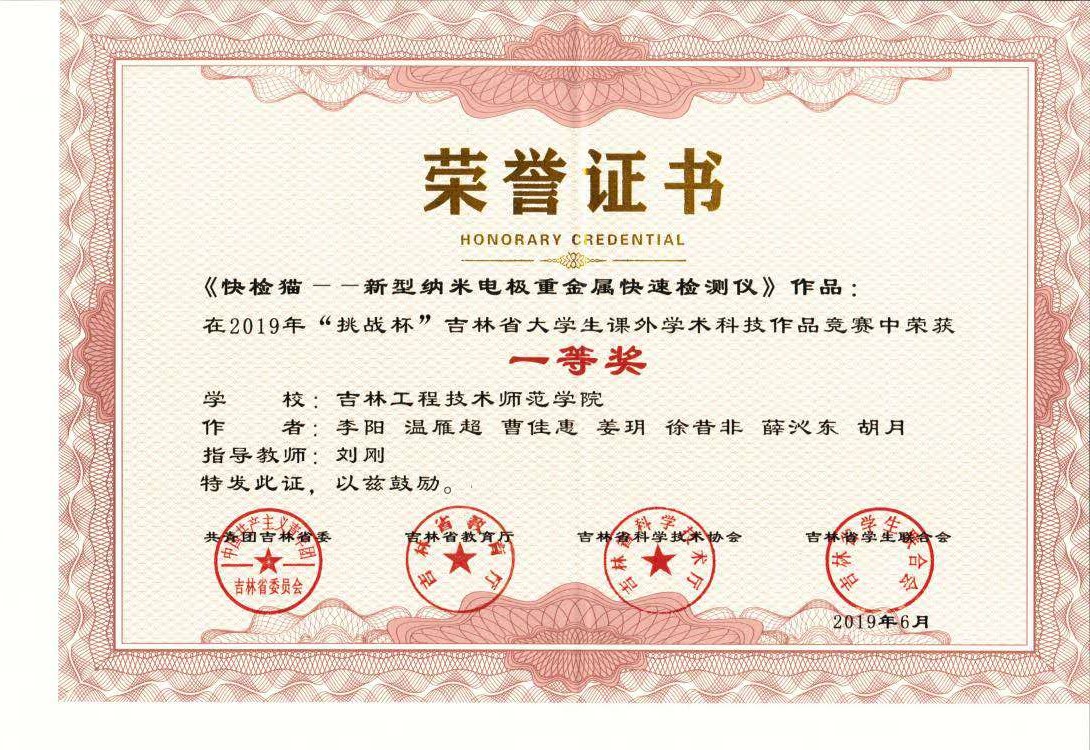 “挑战杯”大学生课外学术科技作品竞赛是由共青团中央、教育部、中国科协、全国学联共同主办的全国性的大学生课外学术实践竞赛,每两年举办一届,在各大高校乃至社会上产生了广泛而良好的影响,被誉为当代大学生科技创新的“奥林匹克”盛会。本届“挑战杯”吉林省大学生课外学社科技作品竞赛共收到来自全省 59 所高校推报的 376 件作品, 经过专家评审、公开答辩等程序共评出“特等奖”11件,“一等奖”33件,其中,best365董鹏中教授指导的作品《“电缆问诊医生”一种对地下电缆实时监控的设备》荣获省级“特等奖”,刘刚教授指导的作品《“快检猫”一款新型纳米电极食品重金属快速检测仪》荣获省级“一等奖”。下一步他们将代表吉林省角逐第十六届“挑战杯”全国大学生课外学术科技作品竞赛。