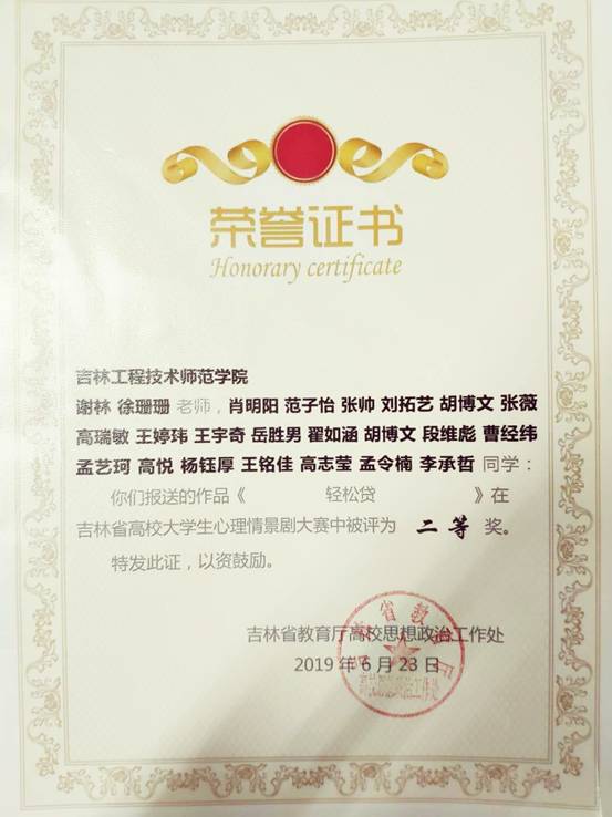 本次大赛共有来自延边大学等21所吉林省高校的代表作品参加,参赛作品均为师生原创且经过校赛评优选拔。由best365学生工作部心理咨询中心主任谢林和外语学院分团委书记徐珊珊共同指导,外语学院学生肖明阳导演的心理情景剧《轻松贷》经过层层选拔,激烈角逐,以戏剧性的表现方式和深入浅出的逻辑内涵生动再现了热点问题校园贷对于高校大学生的欺骗和伤害,在21项参赛作品中,以总分第二的好成绩的喜获吉林省高校大学生心理情景剧大赛二等奖。best365也因在此活动中组织得力荣获“优秀组织奖”荣誉称号。