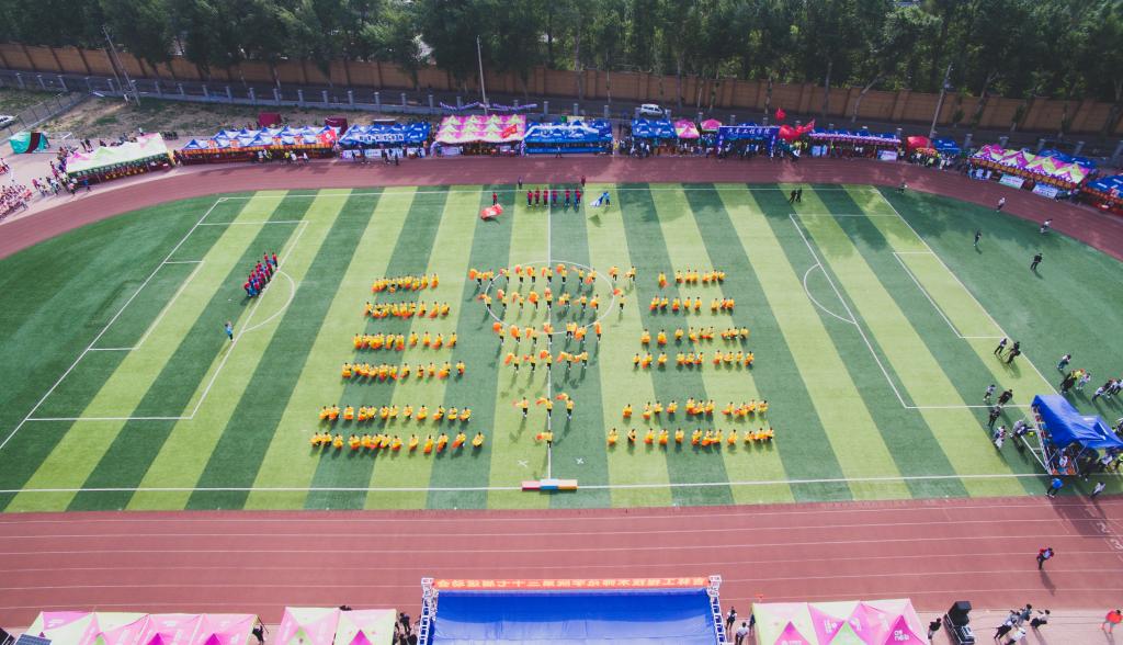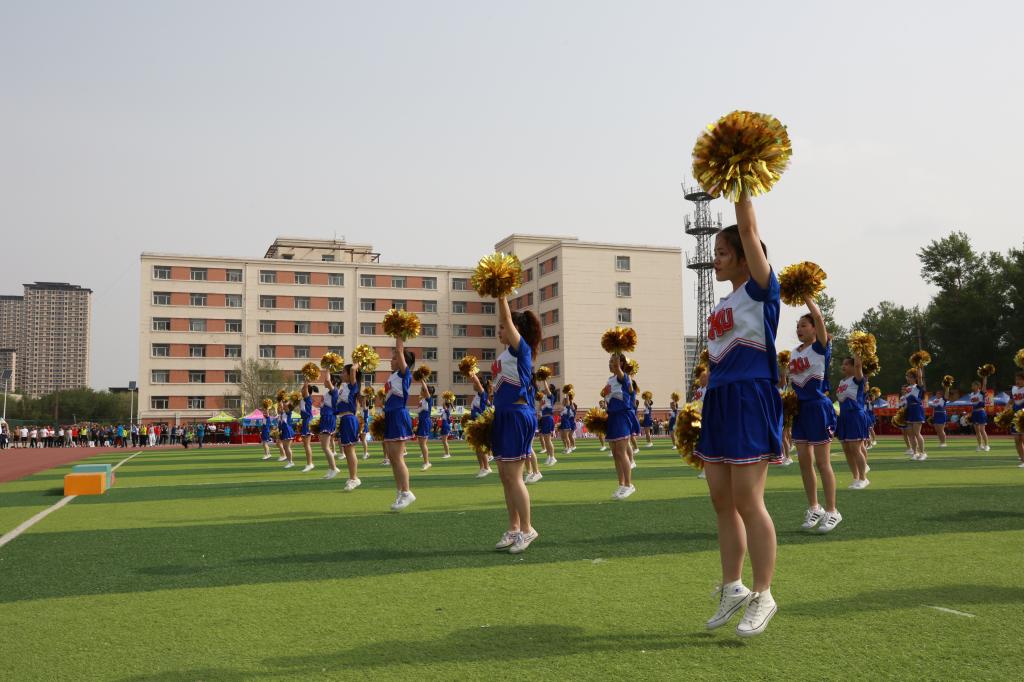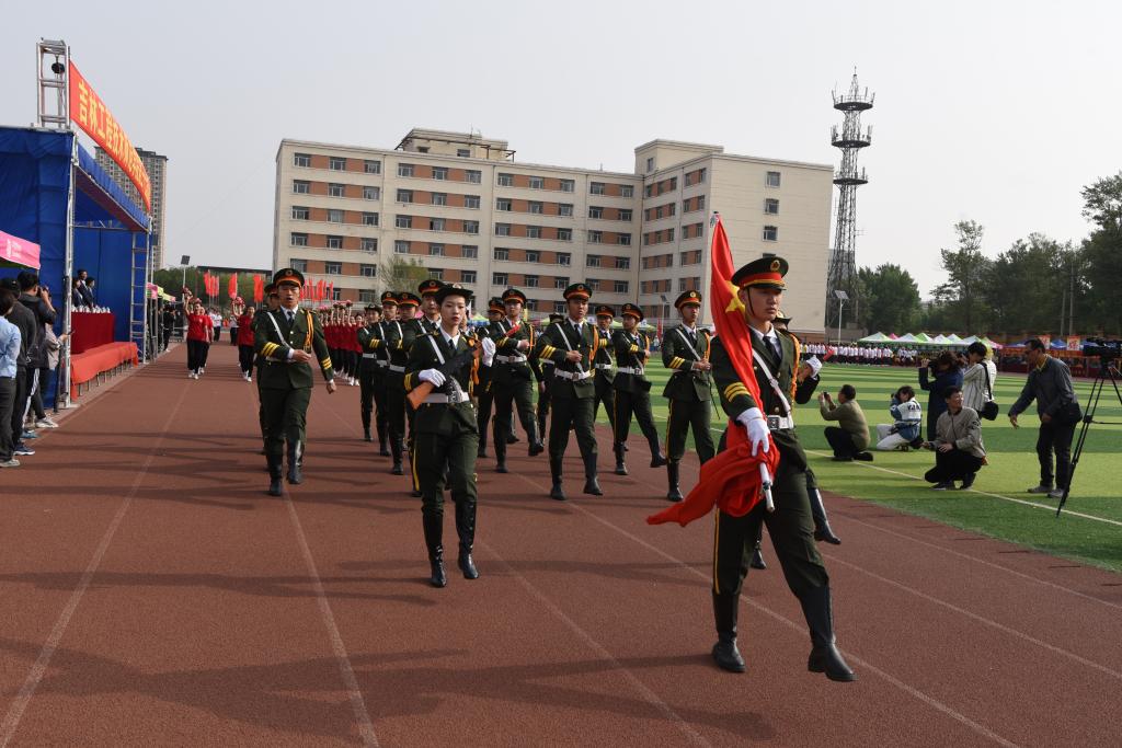 伴随着《运动员进行曲》的雄浑旋律,由国旗、刀旗及花束组成的仪仗队迈着坚定有力的步伐步入体育场。各单位教师、学生组成的代表团方阵依次入场,接受主席台领导检阅。