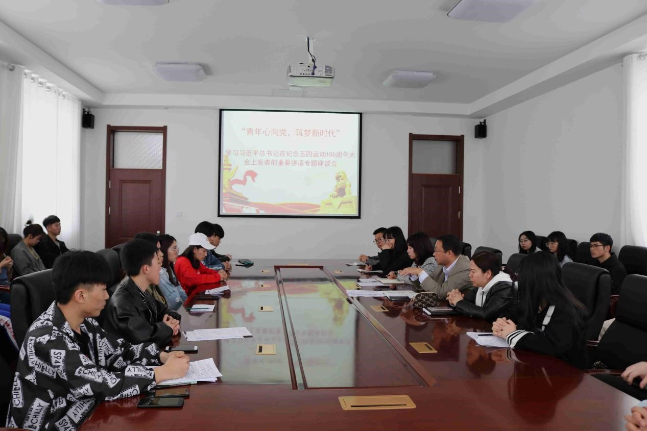 座谈会上,同学们共同观看学习了习近平总书记在纪念五四运动100周年大会上发表重要讲话。习近平总书记高度评价了五四运动的历史意义--五四运动以全民族的力量高举起爱国主义的伟大旗帜、以全民族的行动激发了追求真理、追求进步的伟大觉醒、以全民族的搏击培育了永久奋斗的伟大传统。五四运动以来的100年,是中国青年一代又一代接续奋斗、凯歌前行的100年,是中国青年用青春之我创造青春之中国、青春之民族的100年。习近平总书记寄语广大新时代青年:第一,新时代中国青年要树立远大理想;第二,新时代中国青年要热爱伟大祖国;第三,新时代中国青年要担当时代责任;第四,新时代中国青年要勇于砥砺奋斗;第五,新时代中国青年要练就过硬本领;第六,新时代中国青年要锤炼品德修为。新时代中国青年要自觉树立和践行社会主义核心价值观,善于从中华民族传统美德中汲取道德滋养,从英雄人物和时代楷模的身上感受道德风范,从自身内省中提升道德修为,明大德、守公德、严私德,自觉抵制拜金主义、享乐主义、极端个人主义、历史虚无主义等错误思想,追求更有高度、更有境界、更有品位的人生,让清风正气、蓬勃朝气遍布全社会!
