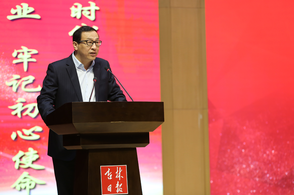 吉林日报社社长张育新向吉报班的同学们寄语:“锻炼脚力眼力脑力笔力,学好看家本领,仗剑闯天涯,勇做追梦人;立志敬业专业创业功业,牢记初心使命,烟雨任平生,不负新时代。”这一巨幅楹联不仅饱含了对同学们的殷切期望,还展现了报社前辈们的职业精神和坚定信念,赢得全场热烈的掌声。
