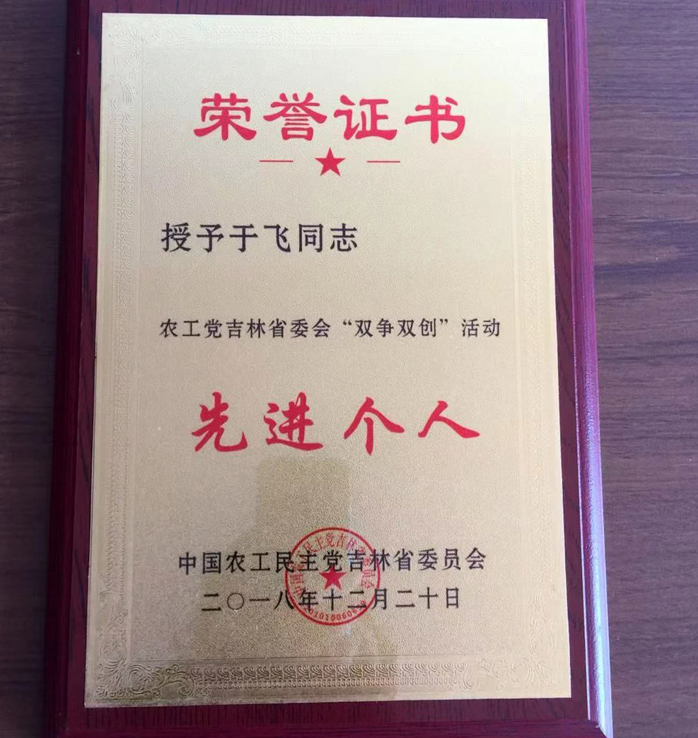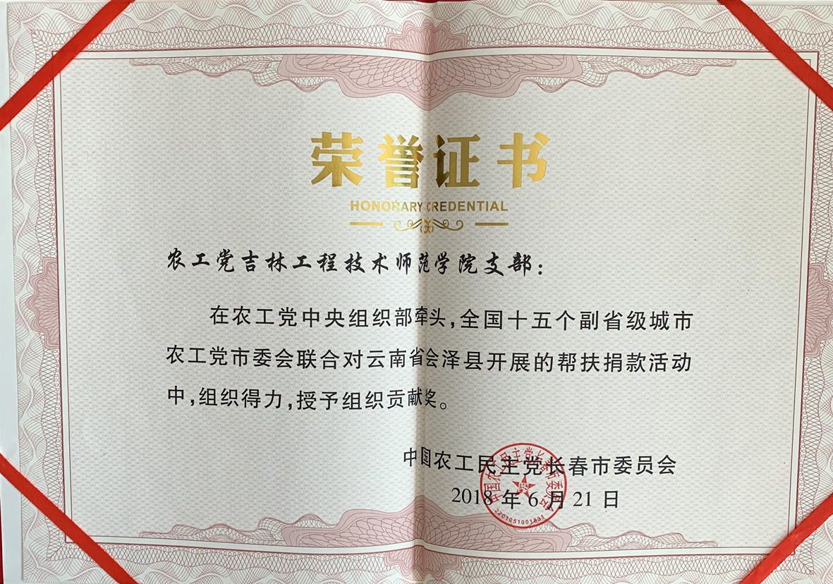 近日,中国农工党吉林省委员会传来喜报,在农工党吉林省委2018年“双争双创”活动表彰大会上,隆重表彰了6个先进基层组织和多名先进个人。best365农工党支部在参政议政及社会服务方面表现突出,获得“先进基层组织”光荣称号。校农工党支部主委于飞教授获得“先进个人”荣誉称号。同时,在农工党中央组织部牵头,全国十五个副省级城市农工党市委会联合对云南会泽县开展的帮扶捐款活动中,组织得力,影响较大,被授予“组织贡献奖”。