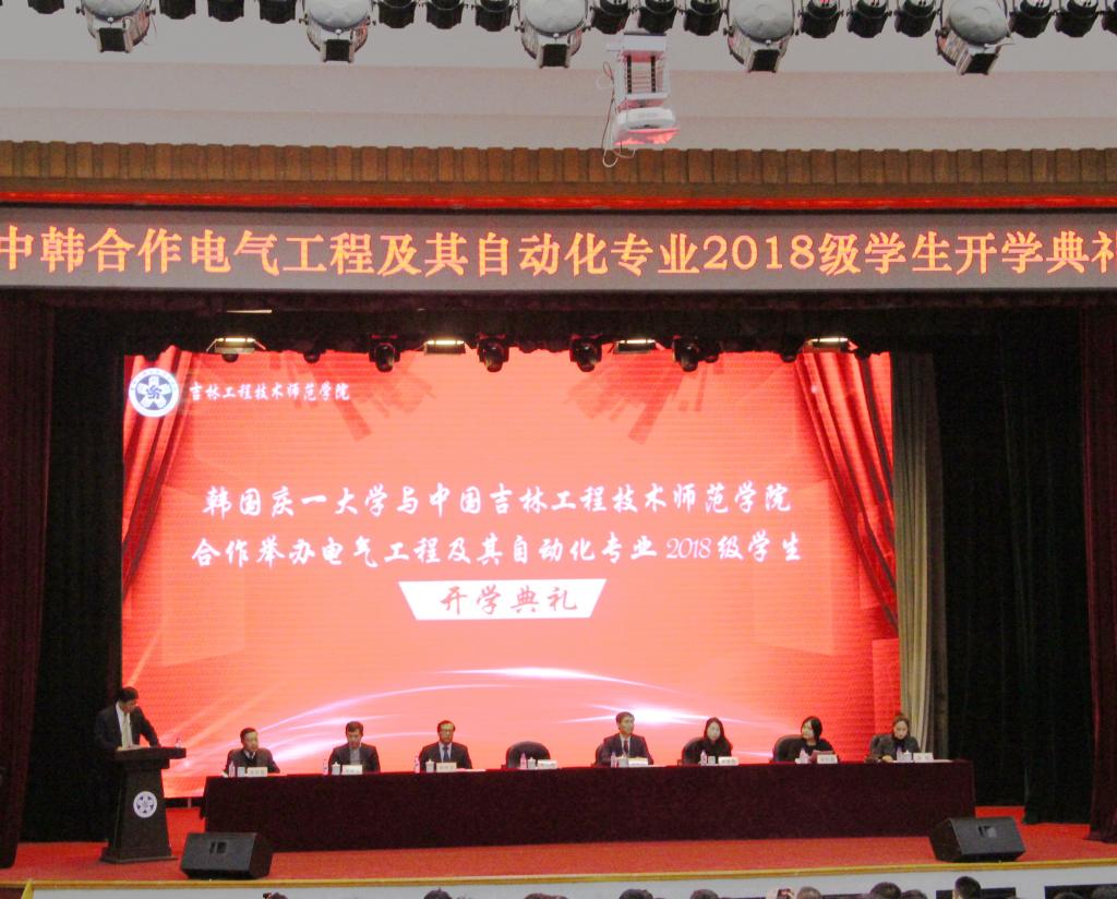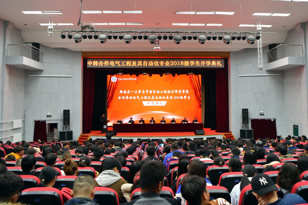 10月23日,学校在报告厅隆重举行中韩合作办学电气工程及其自动化专业学生开学典礼。韩国庆一大学副校长洪在杓、教务学籍处副科长李善爱、对外协力处副科长郑镇圭、机械汽车学部金红花,best365党委书记栾立明、校长杨晓东、党委常委教务处长张存贵出席了开学典礼。典礼由张存贵主持,国际交流处、学工部、校团委领导,电气工程学院党政领导、全体教师及大一新生参加了本次开学典礼。