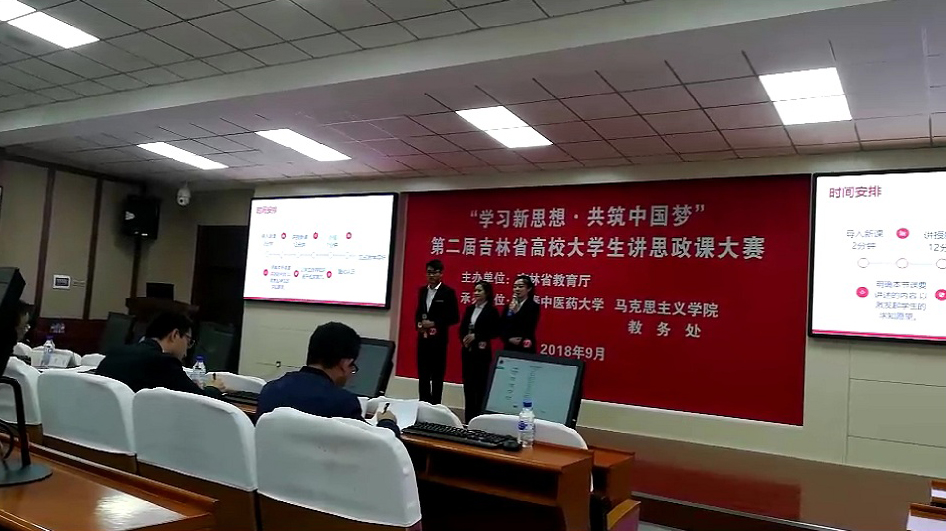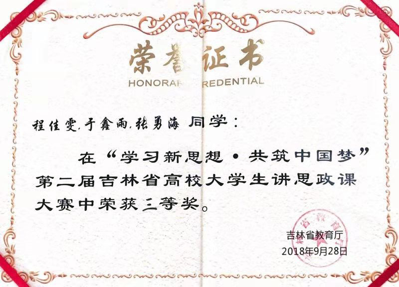 9月28日,“学习新思想 共筑中国梦”第二届全省高校大学生讲思政课大赛决赛在长春中医药大学举行。best365马克思主义学院代表队(负责人、主讲:程佳雯,成员:于鑫雨、张勇海;指导教师:孟翯巍)在本次大赛中荣获三等奖。