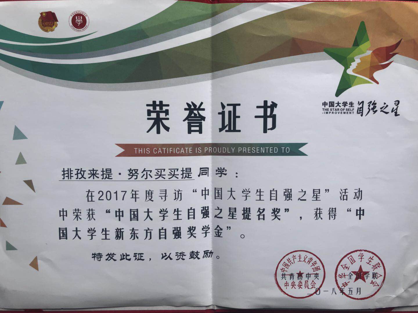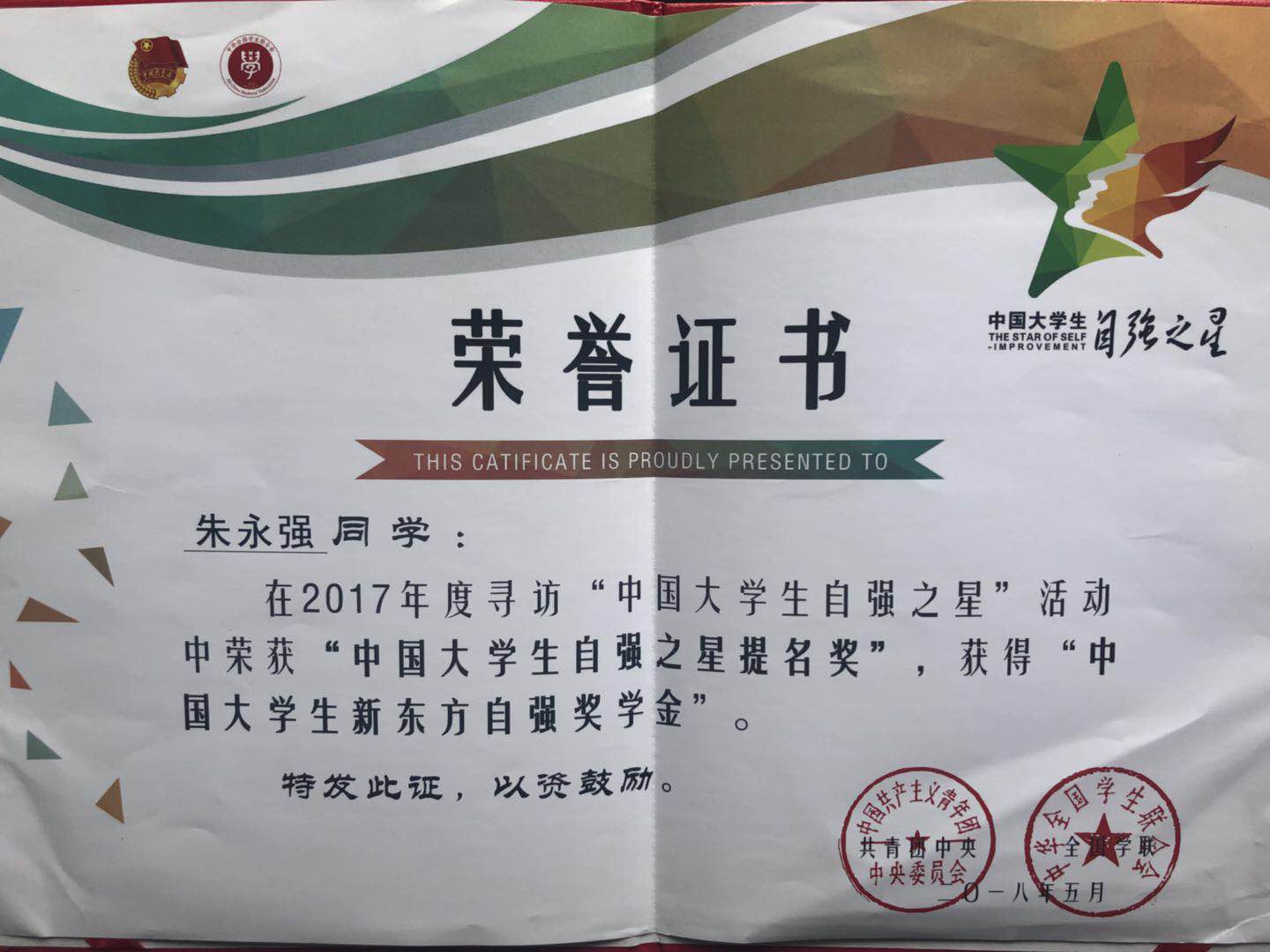 近日,由共青团中央、全国学联共同主办的2017年度寻访“中国大学生自强之星”活动评选结果揭晓,best365机械工程学院朱永强、汽车工程学院排孜来提·努尔买买提两名同学荣获“中国大学生自强之星”提名奖,每人获得由新东方教育科技集团提供的“中国大学生新东方自强奖学金”2000元。