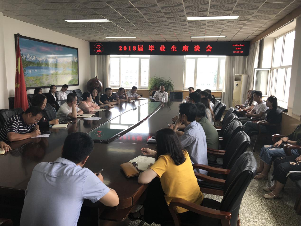 6月14日下午,2018届毕业生座谈会在图书馆楼第一会议室召开,学校党委副书记陈景翊,校办、组织部、宣传部、学工部、教务处、创业就业处、计划财务处、保卫处、后勤管理处、图书馆、教育技术与网络中心等部门负责人与来自各学院的毕业生代表进行了座谈交流。座谈会由学工部部长王宝龙主持。
