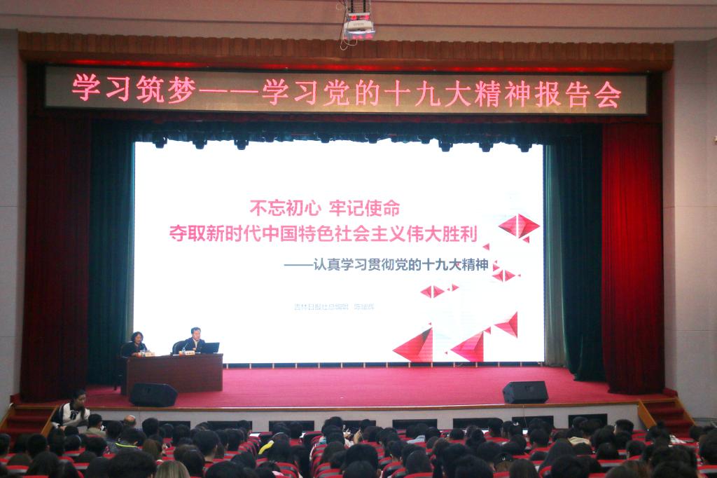 5月10日下午,学校举行学习党的十九大精神报告会,深入学习贯彻习近平新时代中国特色社会主义思想和党的十九大精神,邀请吉林日报社总编辑陈耀辉作专题辅导报告。这是落实大学生“学习筑梦”行动的重要举措,是新时代传习所、学习筑梦班、青马工程培训班的重要一课。学校部分教师代表、学习筑梦班成员、青马学员及大学生骨干500余人参加了报告会。会议由学校纪委书记左伟主持。