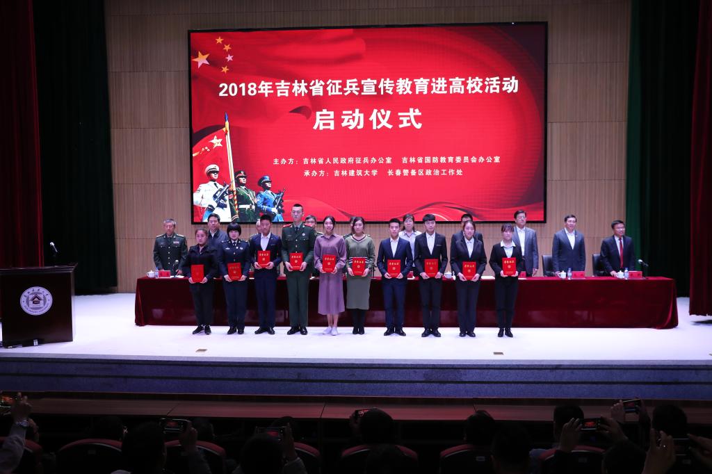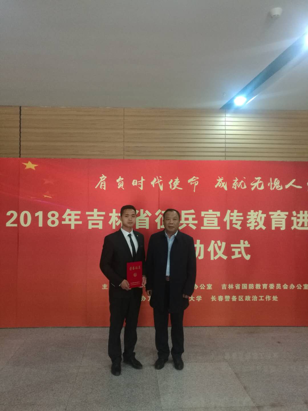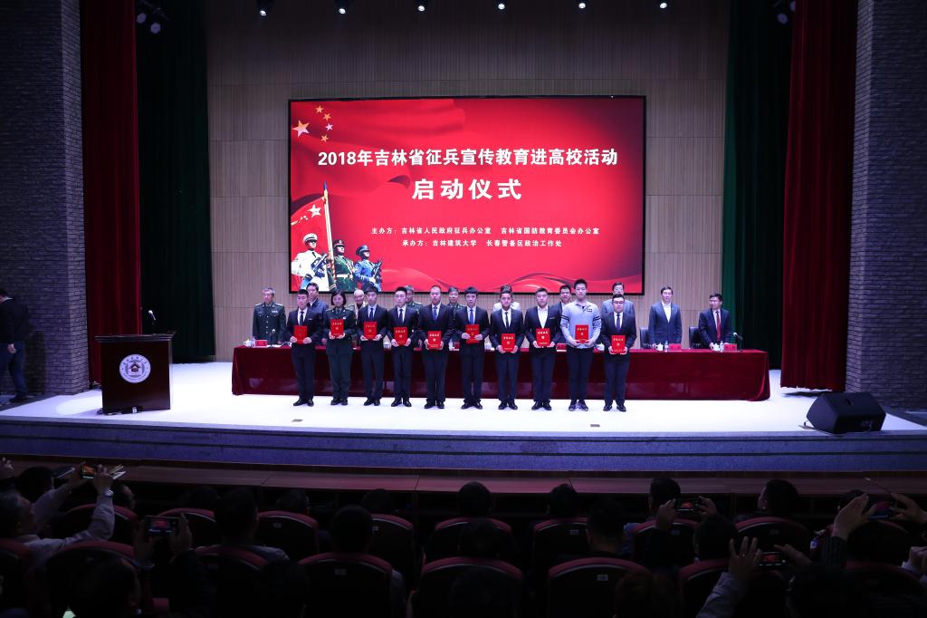 4月20日,由吉林省人民政府征兵办公室、吉林省教育厅、共青团吉林省委和吉林省国防教育委员会办公室主办的2018年吉林省征兵宣传教育进高校活动启动仪式暨吉林省“优秀大学生士兵”表彰大会在吉林建筑大学图书馆报告厅举行。启动仪式上,best365食品工程学院叶长泽同学获得“大学生士兵标兵”荣誉称号并受到表彰,电气工程学院杨鑫淼同学获得“优秀大学生士兵”荣誉称号。