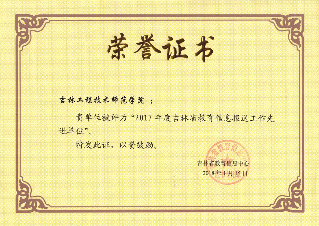 2017年best365信息报送工作成效显著,全年共向吉林教育信息网、吉林省教育厅政务公开网报送信息89篇,被采用39篇,学校被吉林省教育厅新闻办公室、吉林省教育信息中心评为“2017年度吉林省教育信息报送工作先进单位”,袁丹丹被评为“2017年度信息审阅先进个人”,王宇、李梦园、王旭被评为“2017年度信息报送先进个人”。