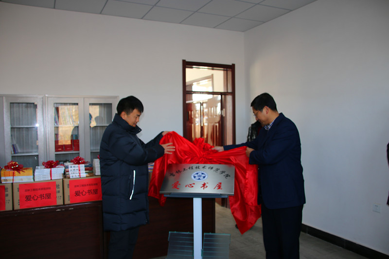 仪式上,宫胜杰和张鹏共同为“大学生创新创业实践基地”揭牌,康清周和宋立军共同为“爱心书屋”揭牌。