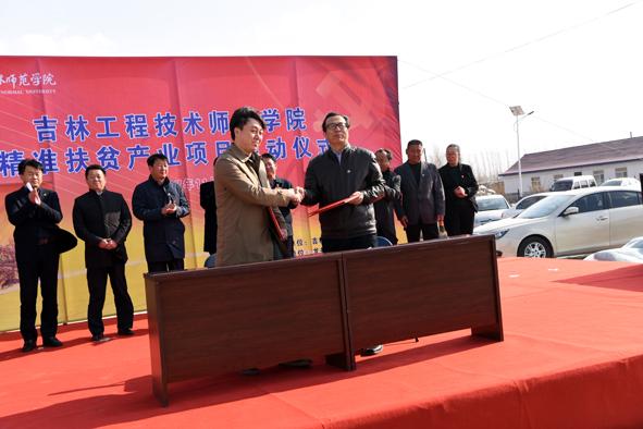 在签约仪式上,杨晓东与廉明村党支部书记金景文共同签订精准扶贫产业项目合同书;高海峰董事长、廉明村驻村第一书记王智彬、廉明村农民专业合作社代表于涛共同签订廉明米业产销合作项目协议书。