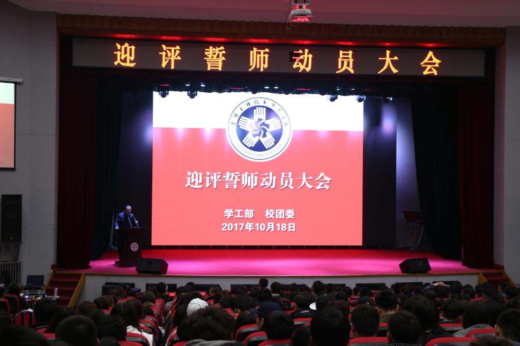 为迎接即将到来的本科教学工作审核评估,10月18日,学工部、校团委在报告厅举办全校学生干部迎评誓师动员大会。校党委副书记陈景翊,校党委常委、教务处处长、评估办主任张存贵,学工部、团委、各分院的领导老师及全校学生干部代表500余人参加了大会。