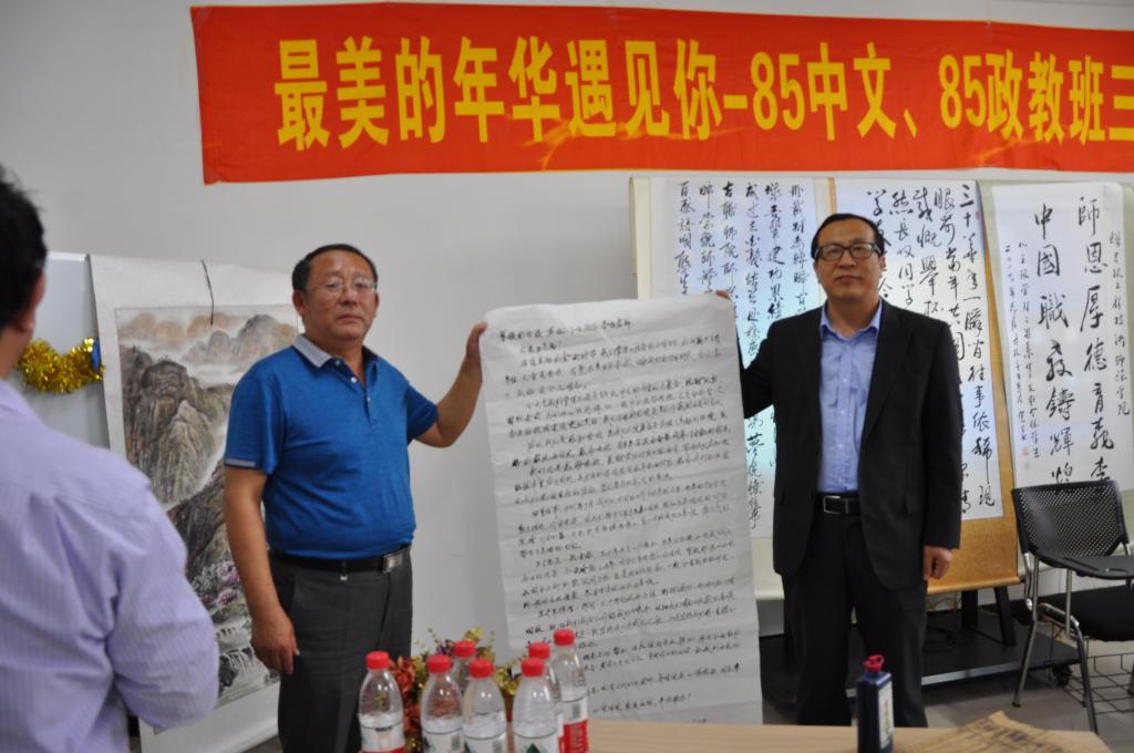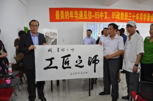 杨晓东校长参加了校友们的主题班会,他代表学校对校友们的到来表示热烈的欢迎,并向校友们详细介绍了学校近些年来的发展状况和取得的突出成绩,以及学校整体迁建和申硕等未来几年的发展方向和工作重点。晓东校长呼吁校友们要经常关注母校,多多支持学校的建设和发展,最后嘱咐校友们要“常回家看看”。校友们对学校领导和校友会的热情迎接表示衷心的感谢,并对学校在目前如此困难的情况下取得的成绩引以自豪。校友代表王永吉教授向晓东校长赠送了字画和同学们亲笔书写的感谢信长卷,知名书法家侯宪台校友现场挥毫“工匠之师”表达对母校的敬仰之情和培育之恩。