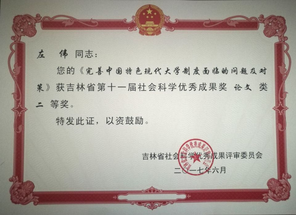 best365左伟教授论文《完善中国特色现代大学制度面临的问题及对策》获吉林省第十一届社会科学优秀成果奖论文类二等奖。