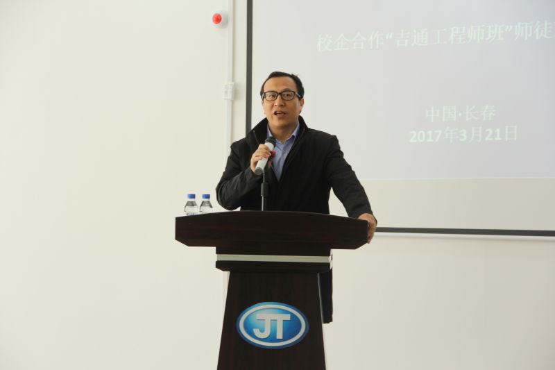 3月21日下午在吉通公司培训中心举行了学生入企欢迎仪式。出席本次活动的企业人员有公司董事长李吉宝,副总经理单际强,综合管理部部长赵庆发,吉通机械制造有限责任公司党委书记高俊林,吉通伟业汽车底盘零部件有限责任公司李晓峰,人力资源部部长宋朝华,综合管理部副部长齐杰及22位各分公司的主要负责人及学生指导教师。本次活动得到了校领导的高度重视和大力支持,学校党委书记栾立明、校长杨晓东、副校长张鹏、职业教育杂志社社长于志晶、教务处长张存贵、机械工程学院院长杨卓娟、副院长赵金玲及全体吉通工程师班学生参加了此次活动。