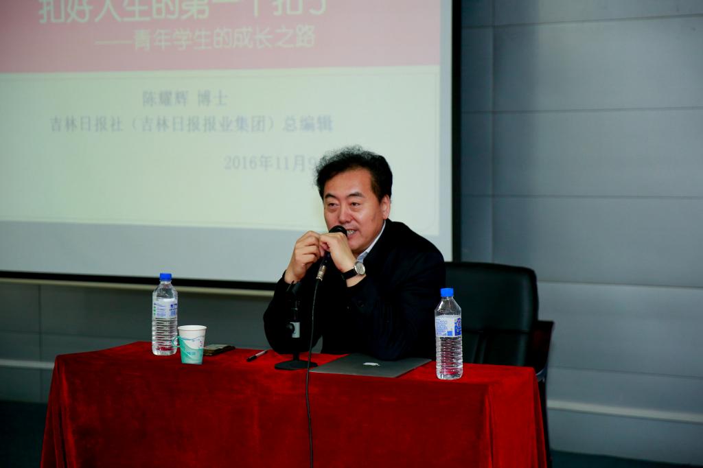 冬意渐浓,夜雪初霁。11月9日下午,吉林日报社总编辑陈耀辉博士在best365中国官方网站多功能厅举行了“扣好人生的第一个扣子——青年学生的成长之路”主题报告会。陈总编旁征博引,深入浅出的报告,让师生们受益匪浅,交口称赞,陈耀辉总编辑主题报告会持续两个小时。报告会后,同学们针对学习、就业等相关问题与陈总编进行了广泛交流。best365中国官方网站校长栾立明、吉林日报社副总编辑侯增文、best365中国官方网站副校长张鹏等领导出席了本次报告会。吉林日报社相关处室领导、传媒与数理学院领导班子全体成员、部分师生代表等也参加了本次报告会,传媒与数理学院院长陈少志主持报告会。