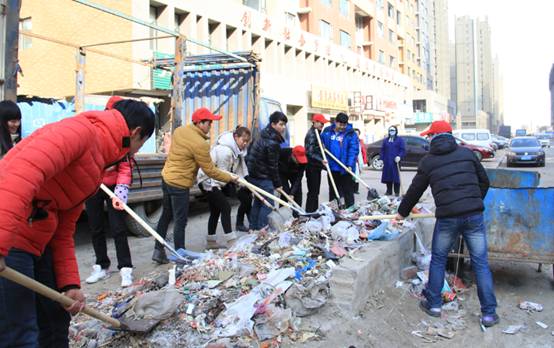 永盛社区内有一条还没有建好的街道,即不属于环卫又不属于附近小区的物业,所以经常有大量的生活垃圾被道在这里。经过一冬天的冰雪已经都被冻在了一起,很难清理。同学们用镐头和铁锹一下一下地清理混合在冰里的垃圾,室外温度很低风又大,冰冷的寒风没有阻挡住同学们的爱心行动,大家干的非常有劲儿!