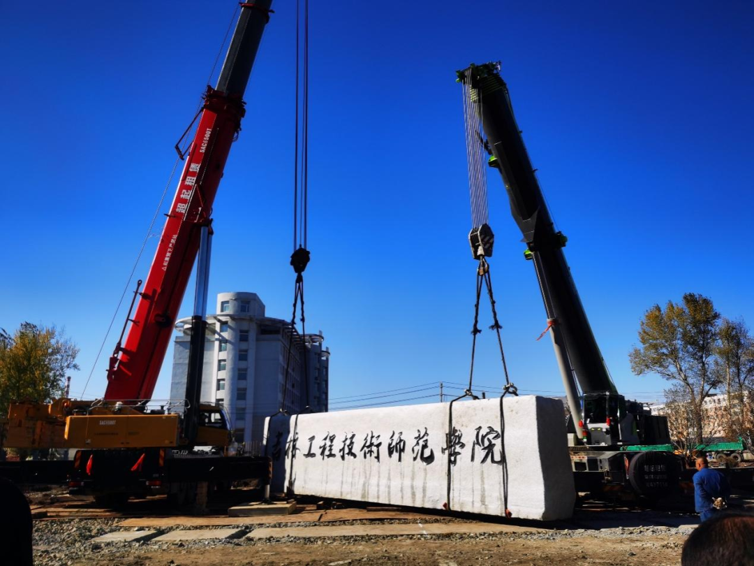 上午8点30分,两台重型吊车同时启动开始凯旋校区东门校名石的吊卸工作,经过起吊、翻转、对位等近3个小时的紧张工作,11点08分,校名石牢牢地坐实在基座上。