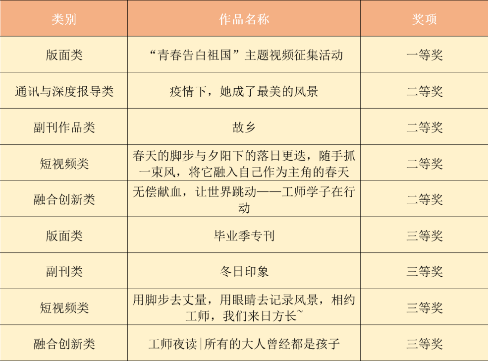 由周颖,程宇编辑的《“青春告白祖国”主题视频征集活动》获版面类一等奖;由熊文竹撰写的《疫情下,她成了最美的风景》获通讯与深度报道类二等奖;由赵惠琳撰写的《故乡》获副刊作品类二等奖;由许智明,陶嘉鹏制作的《春天的脚步与夕阳下的落日更迭,随手抓一束风,将它融入自己作为主角的春天》获短视频类二等奖;由白鹭,何佳泽撰写的《无偿献血,让世界跳动——工师学子在行动!》获融合创新类二等奖;由周颖,程宇编辑的《毕业季专刊》获版面类三等奖;由郝真撰写的《冬日印象》获副刊类三等奖;由王瑞雪制作的《用脚步去丈量,用眼睛去记录风景,相约工师,我们来日方长~》获短视频类三等奖;由熊文竹制作的《工师夜读 | 所有的大人曾经都是孩子》获融合创新类三等奖。