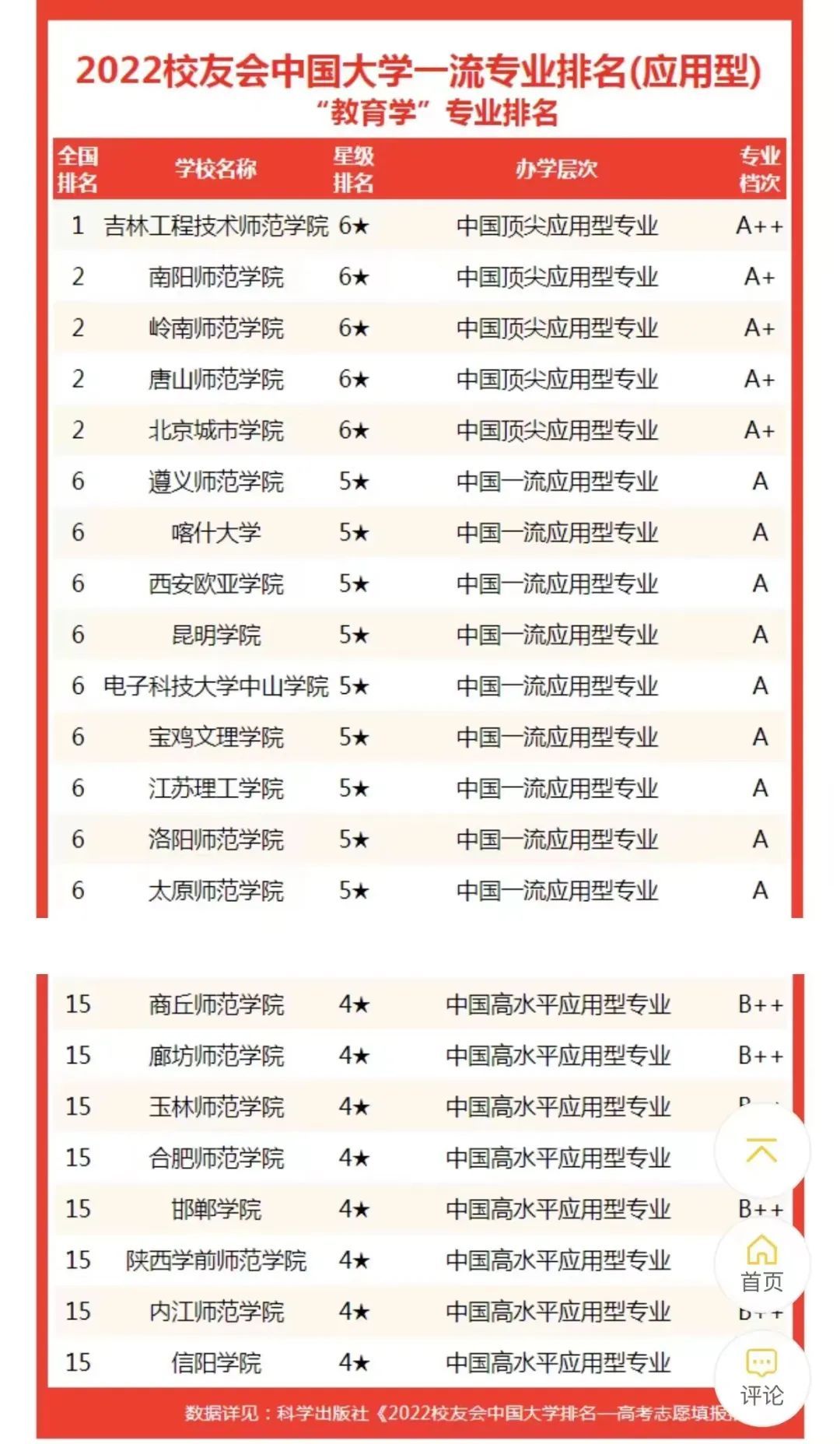 榜单显示,在教育学专业排名(应用型)中,best365中国官方网站(6★,A++)实力最强,排名第一;南阳师范学院(6★,A+)、唐山师范学院(6★,A+)、岭南师范学院(6★,A+)、北京城市学院(6★,A+)位列第二;以上5所学校荣膺为2022中国六星级应用型专业(6★),进入中国顶尖应用型专业行列。电子科技大学中山学院(5★,A)、喀什大学(5★,A)、昆明学院(5★,A)、西安欧亚学院(5★,A)、太原师范学院(5★,A)、江苏理工学院(5★,A)、遵义师范学院(5★,A)、宝鸡文理学院(5★,A)、洛阳师范学院(5★,A)位列第六,荣获2022中国五星级应用型专业(5★),进入中国一流应用型专业行列。