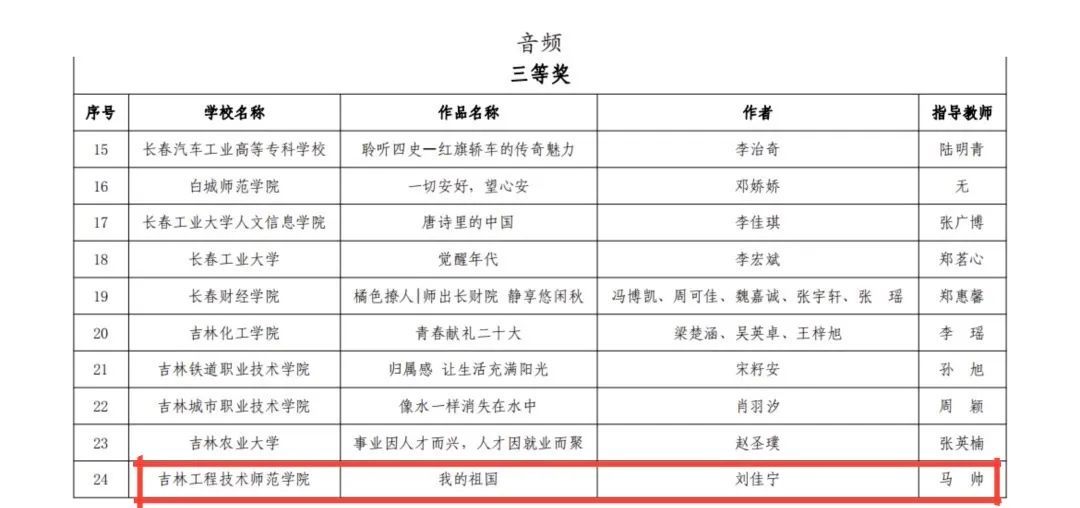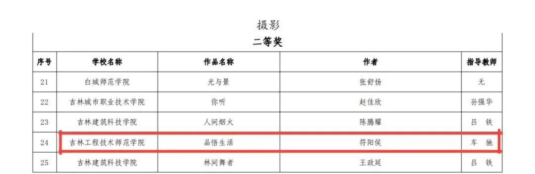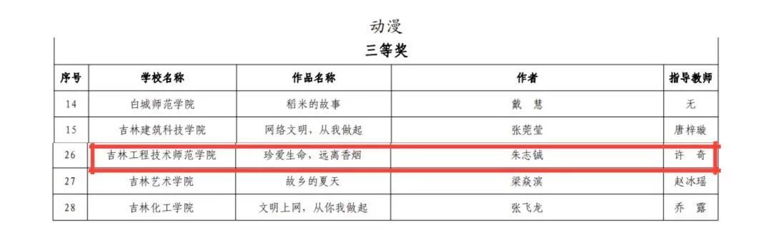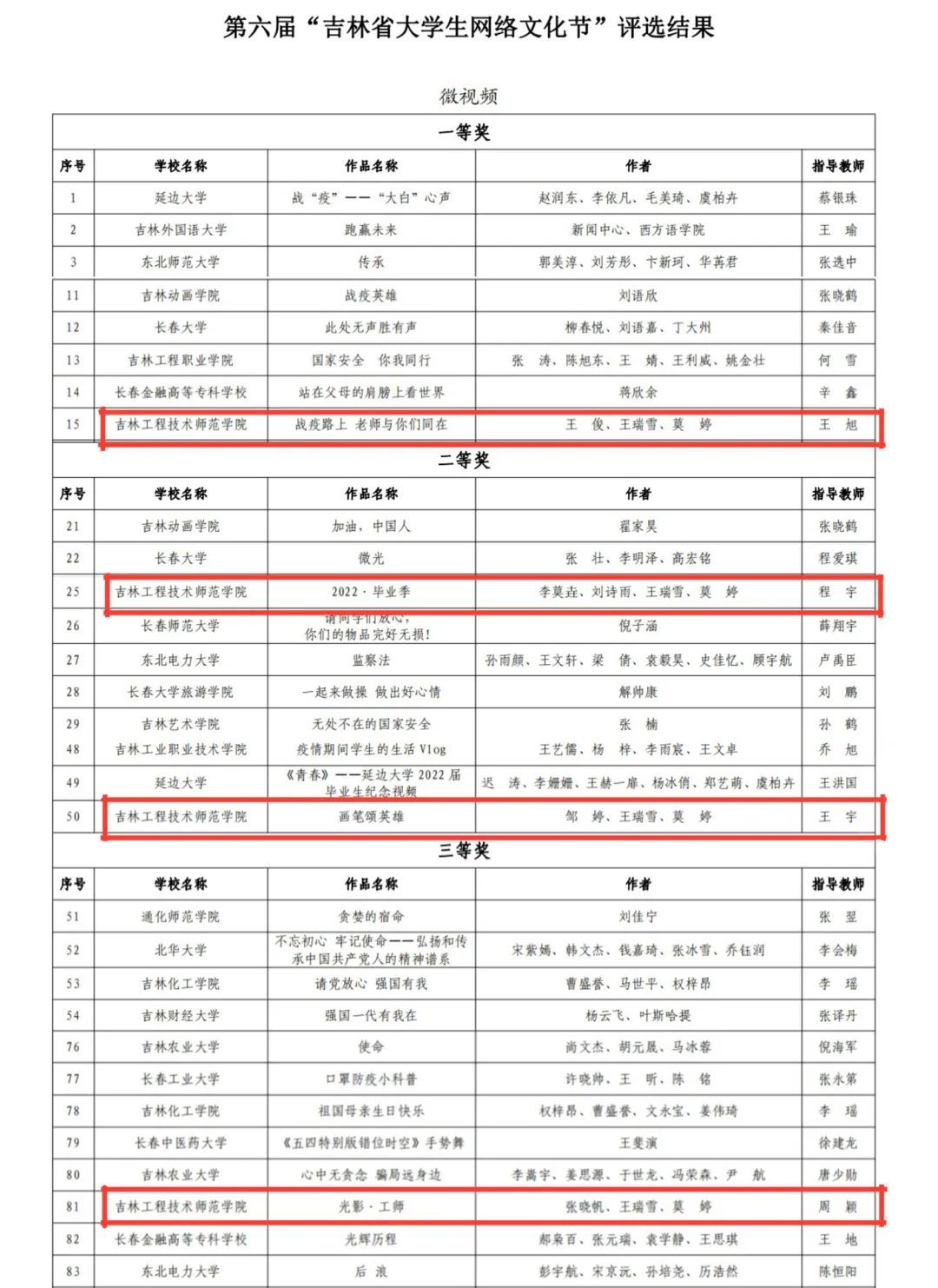 在第六届“吉林省大学生网络文化节”评选结果中,由王俊、王瑞雪、莫婷制作的《战疫路上 老师与你们同在》获微视频赛道一等奖;由李莫垚、刘诗雨、王瑞雪、莫婷制作的《2022·毕业季》,由邹婷、王瑞雪、莫婷制作的《画笔颂英雄》获微视频赛道二等奖;由符阳侯拍摄的《品悟生活》获摄影赛道二等奖;由柴桂芳撰写的《告诉她,青春,便是如此》,由程佳莹撰写的《白云苍狗 日新月异——教育之于我们》获网文赛道二等奖;由张晓帆、王瑞雪、莫婷制作的《光影·工师》获微视频赛道三等奖;由王铁翔制作的《谁的青春不迷茫》获微电影赛道三等奖;由朱志铖制作的《珍爱生命,远离香烟》获动漫赛道三等奖;由刘佳宁制作的《我的祖国》获音频赛道三等奖。