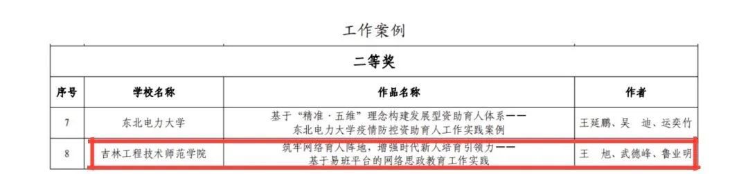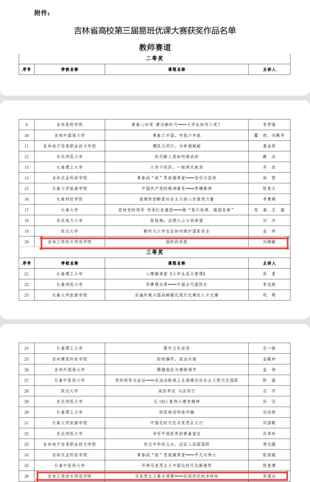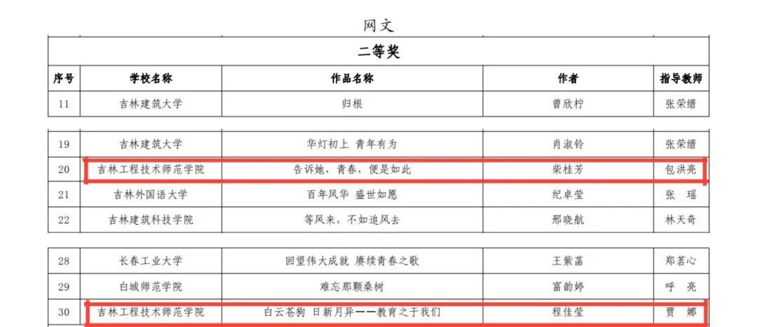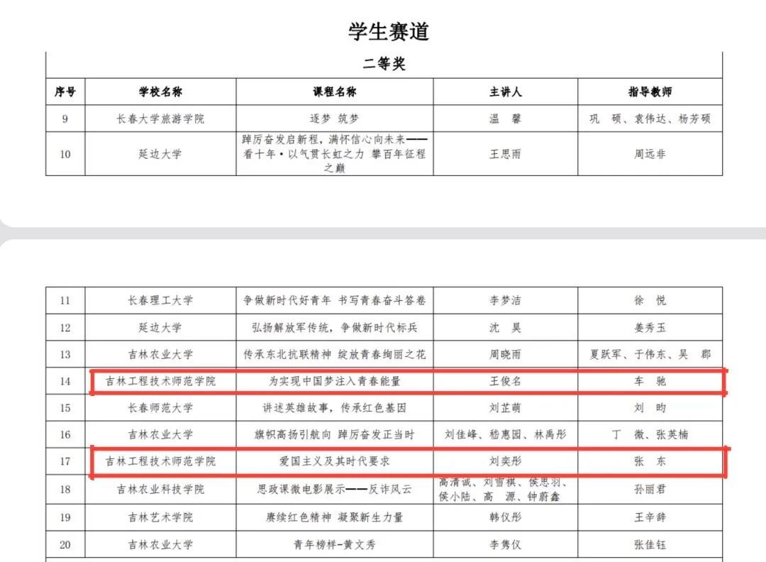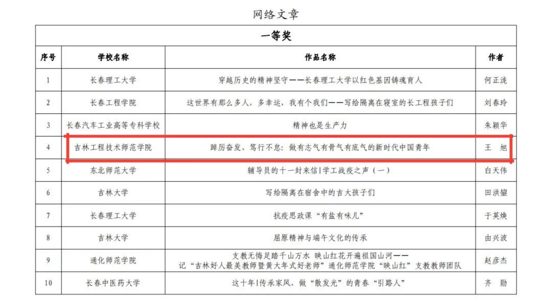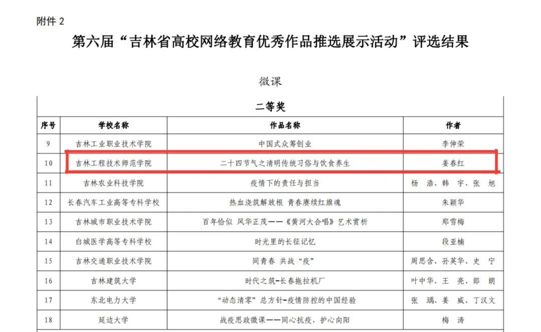 在第六届“吉林省高校网络教育优秀作品推选展示活动”评选结果中,由宣传部王旭撰写的《踔厉奋发,笃行不怠:做有志气有骨气有底气的新时代中国青年》获网络文章赛道一等奖;由经济与管理学院姜春红制作的《二十四节气之清明传统习俗与饮食养生》获微课赛道二等奖;由宣传部王旭,学工部武德峰、鲁业明撰写的《筑牢网络育人阵地,增强时代新人培育引领力——基于易班平台的网络思政教育工作实践》获工作案例赛道二等奖。