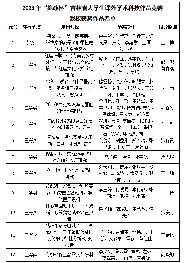 据悉,2023年“挑战杯”吉林省大学生课外学术科技作品竞赛自启动以来,共吸引来自全省51所学校的近万名大学生参赛,申报参赛项目547个。经资格审查、复赛、决赛阶段专家现场评审、路演答辩、国赛训练营、优秀作品排位赛等环节,全省共评选出特等奖作品28件、一等奖作品59件、二等奖作品70件、三等奖作品280件。其中56件作品推报国赛。best365省级“特等奖”获奖项目《秸柔电子-基于废弃秸秆纤维素的离子凝胶柔性电子皮肤应变传感器》、省级“一等奖”获奖项目《红色研学 ·助力美丽乡村建设—关于参与式文化环境下的红色文化传播路径研究》将继续代表吉林省参加2023年“挑战杯”全国总决赛的角逐。