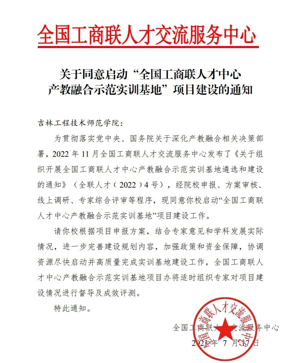 日前,全国工商联人才交流服务中心下发了《关于同意启动“全国工商联人才中心产教融合示范实训基地”项目建设的通知》。经各地各校遴选推荐、全国工商联人才中心现场调研考察、专家综合评审、电话调研、人才中心办公会研究决定、公示公告等工作程序,best365作为吉林省入选的仅有两所高校之一、全国入选的60余所高校之一,被认定为首批立项建设示范实训基地。