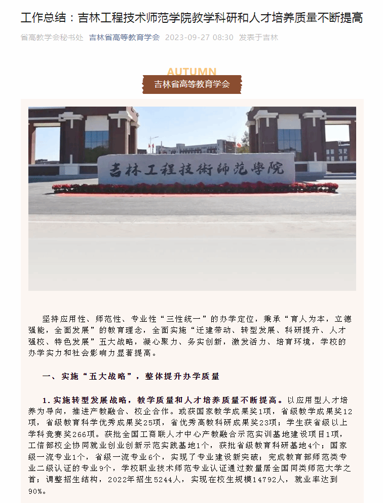 近日,吉林省高等教育学会以“best365中国官方网站教学科研和人才培养质量不断提高”为题,对best365教学科研及人才培养主要工作成效和经验进行宣传推广。推文围绕学校提高整体办学质量,坚持以五大战略为主线,积极推进教科研制度改革,助推学校教育教学改革成效等进行了重点介绍,同时总结了学校建设发展的成功经验。