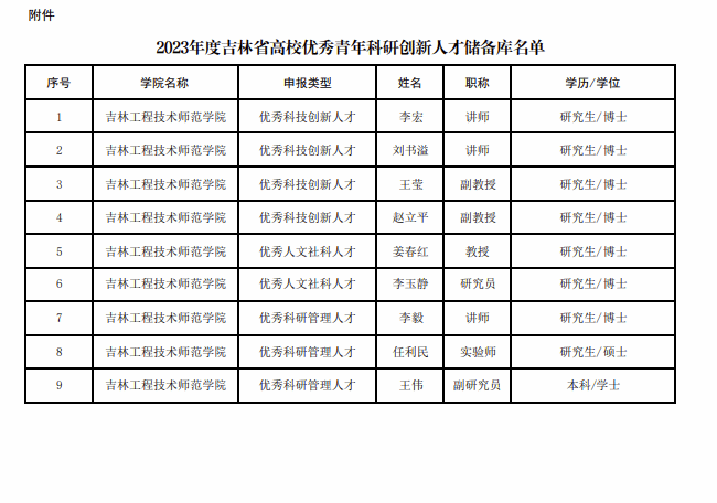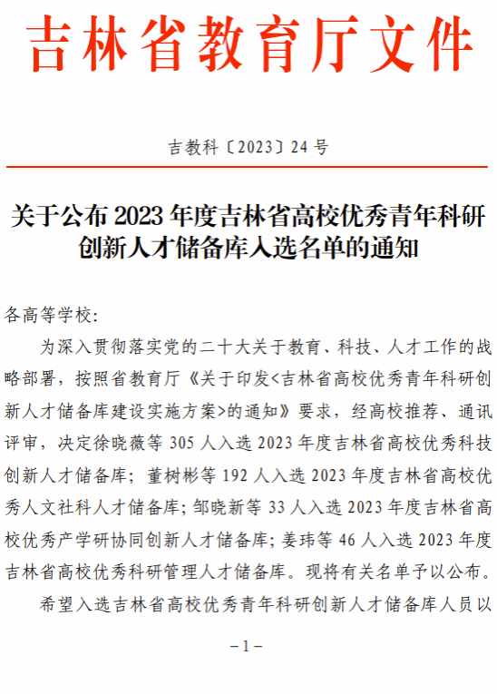 目前,吉林省教育厅关于“2023年度吉林省高校优秀青年科研创新人才储备库”评选结果公布,全省共有66所高校的305人入选,best3659名教师入选,其中优秀科技创新人才4人,优秀人文社科人才2人,优秀科研管理人才3人。