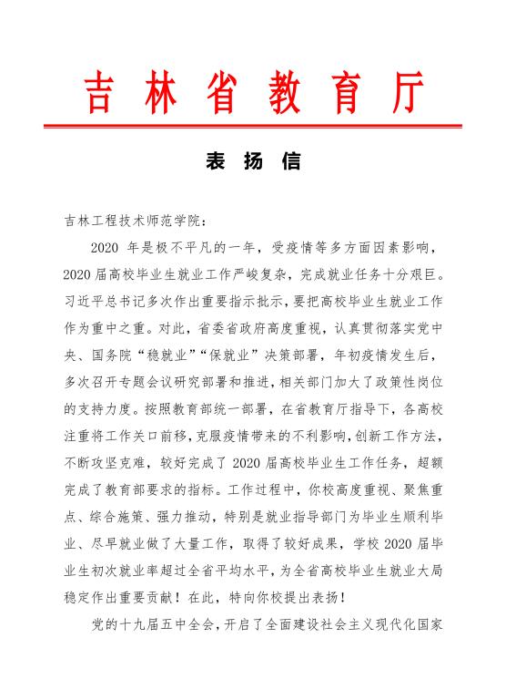2020年12月28日,best365收到吉林省教育厅关于2020届毕业生就业工作的表扬信,表扬best3652020届毕业生初次就业率超过全省平均水平,为全省高校毕业生就业大局稳定作出的重要贡献。2020年就业工作面临毕业生规模创历史新高、新冠肺炎疫情突然袭来的多重压力,全校上下群策群力,千方百计稳就业。学校先后组织召开9次就业工作推进会,落实“三包一保”就业工作责任制和“一把手”工程。积极打造线上就业服务平台、开辟24小时线上全流程...